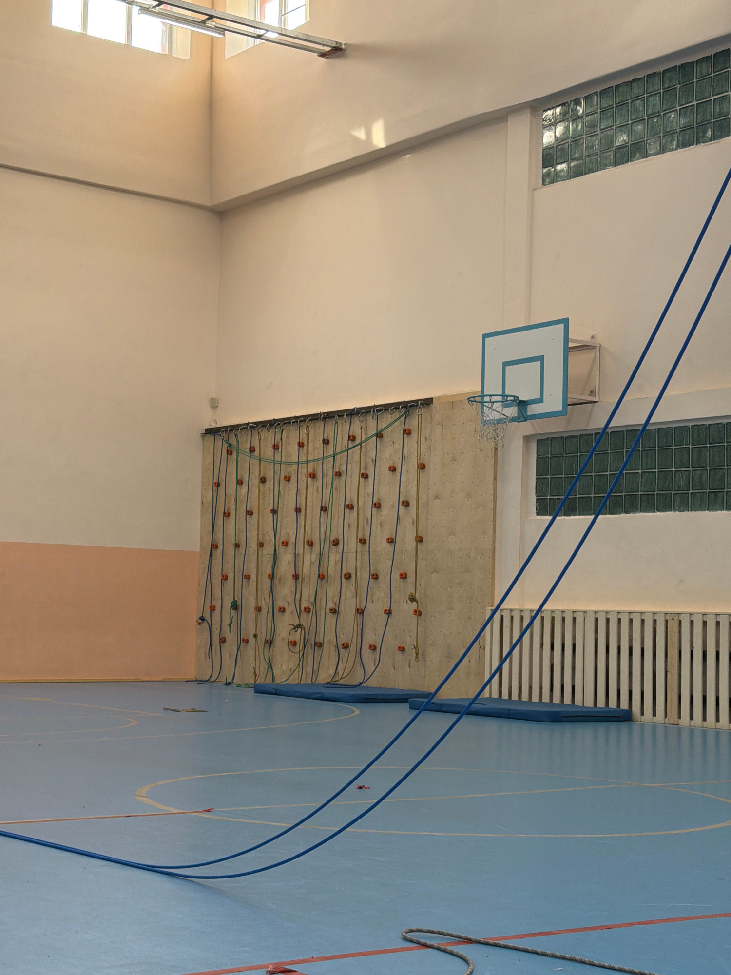 The image shows the interior of a gymnasium in Berezniki, Russia. The gym features a blue floor with white and red lines marking the court, and a wall-mounted rock climbing structure with red climbing…read more