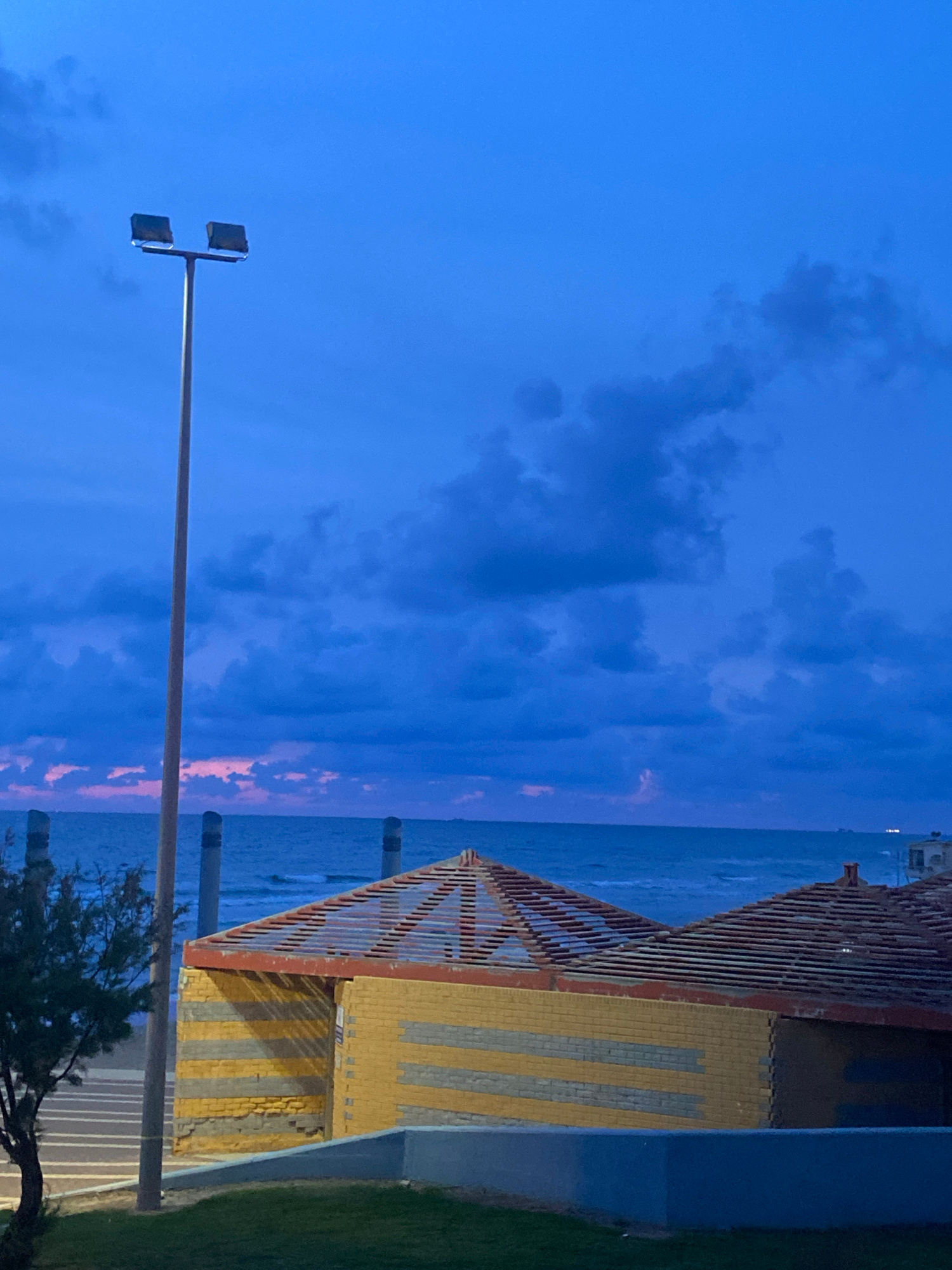 The image shows a night scene in Haifa, Israel, featuring a building near the sea. The sky is blue, with some clouds and a hint of pink in the horizon. A tall lamppost stands prominently in the foregr…read more