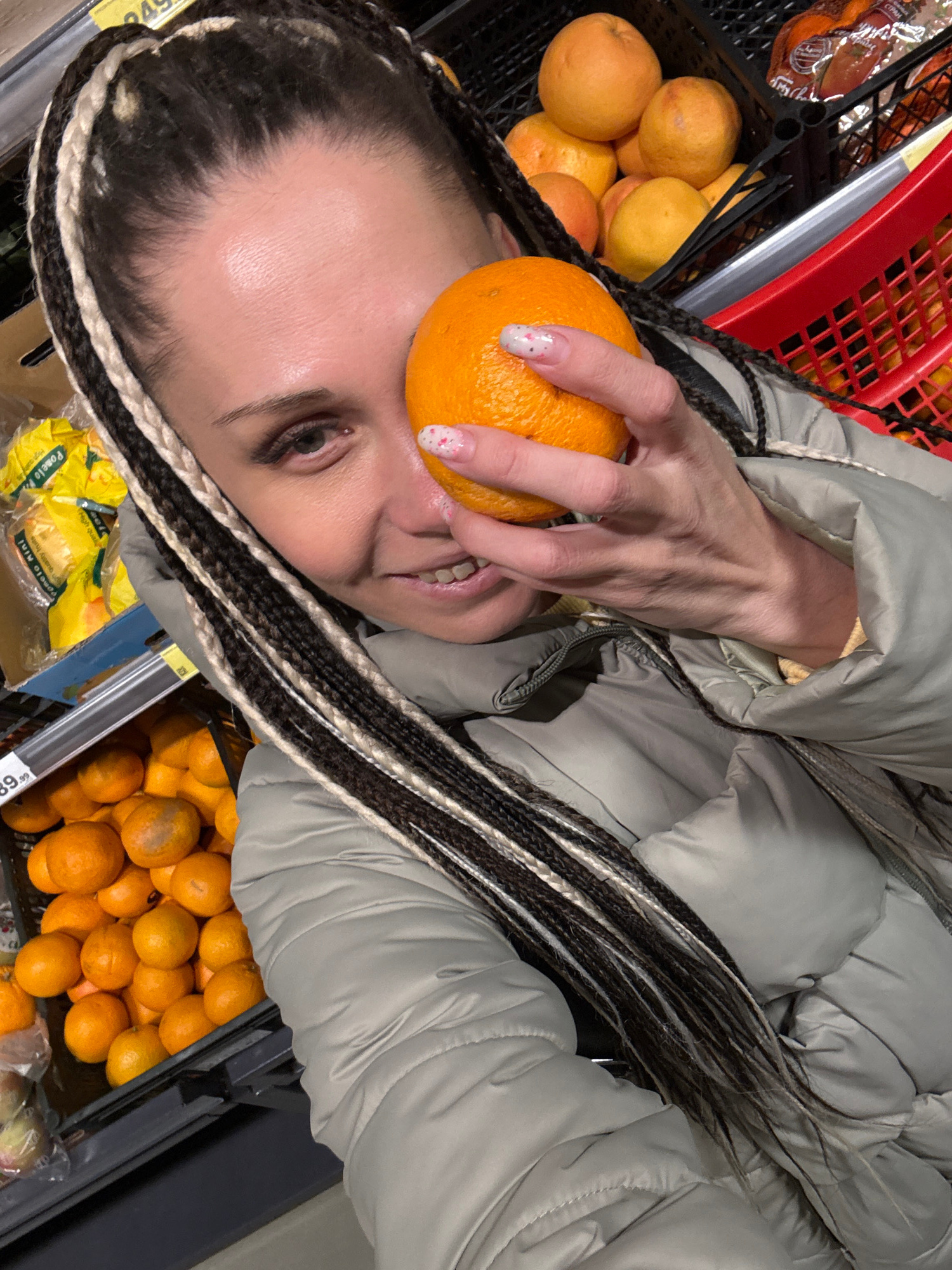 A woman with braids poses with an orange in a grocery store. The location is possibly in the city of Rusanovo, Russia, though this cannot be definitively determined from the image. She is wearing a gr…read more