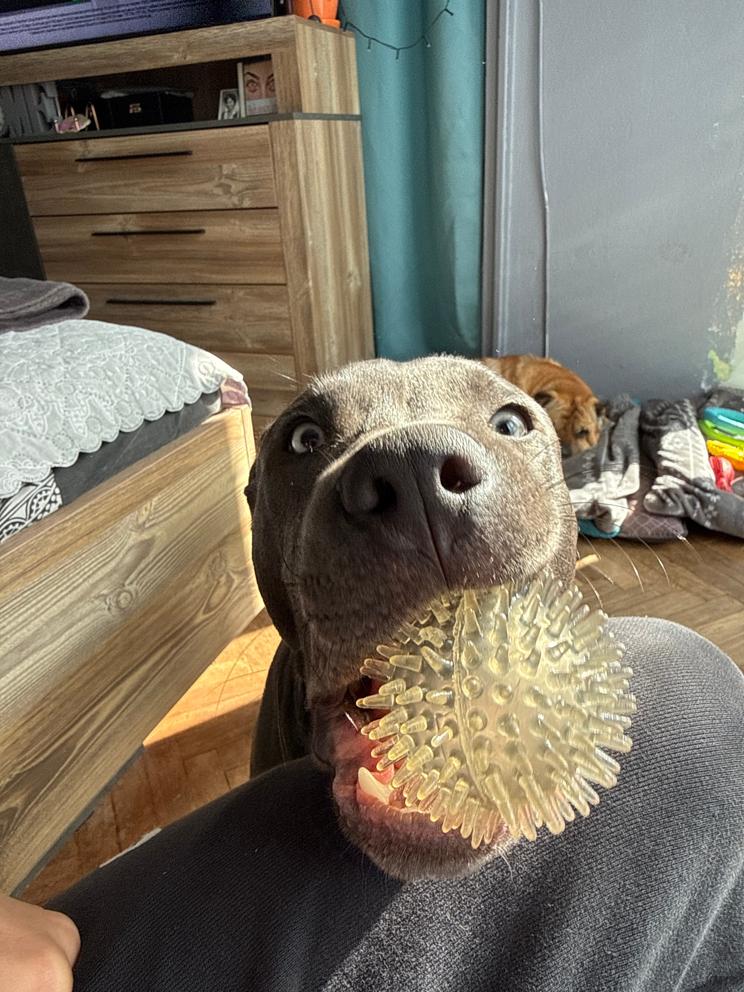 The image, captured from a slightly tilted perspective, focuses on a close-up of a grey dog holding a clear, spiky rubber ball toy in its mouth. The dog’s dark nose and one bright eye are prominent in…read more