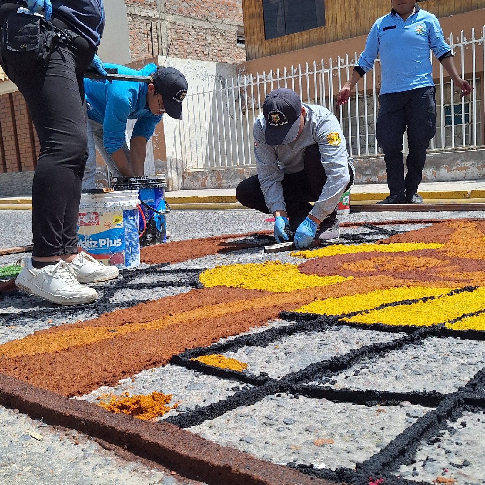 Jacobo Hunter, Peru. Three people are seen constructing a large pavement artwork using colored granular materials. A person in a light blue uniform is standing near a metal gate, possibly observing thβ¦read more