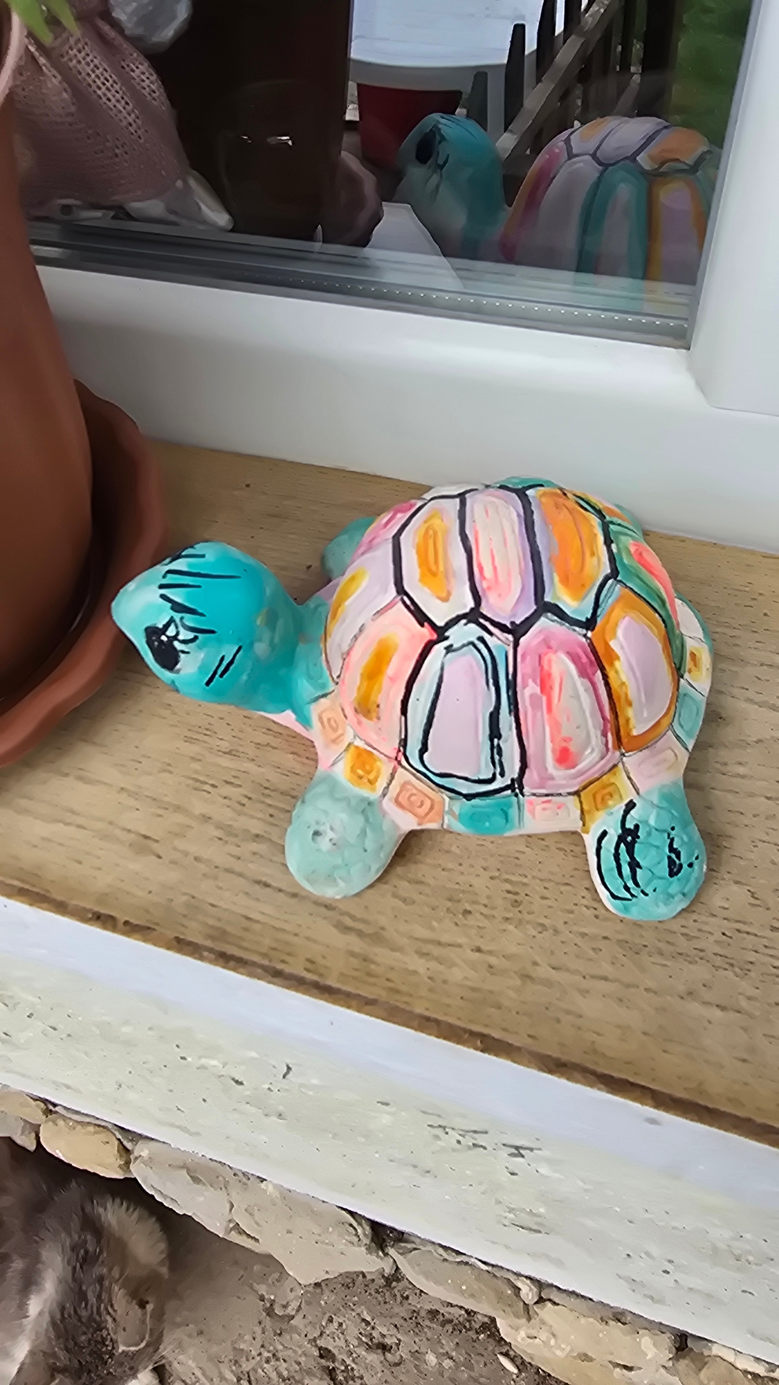 A colorful, hand-painted ceramic turtle figurine is the central subject of this image, positioned on a light brown wooden ledge. The turtle's shell is adorned with various pastel shades including pink…read more