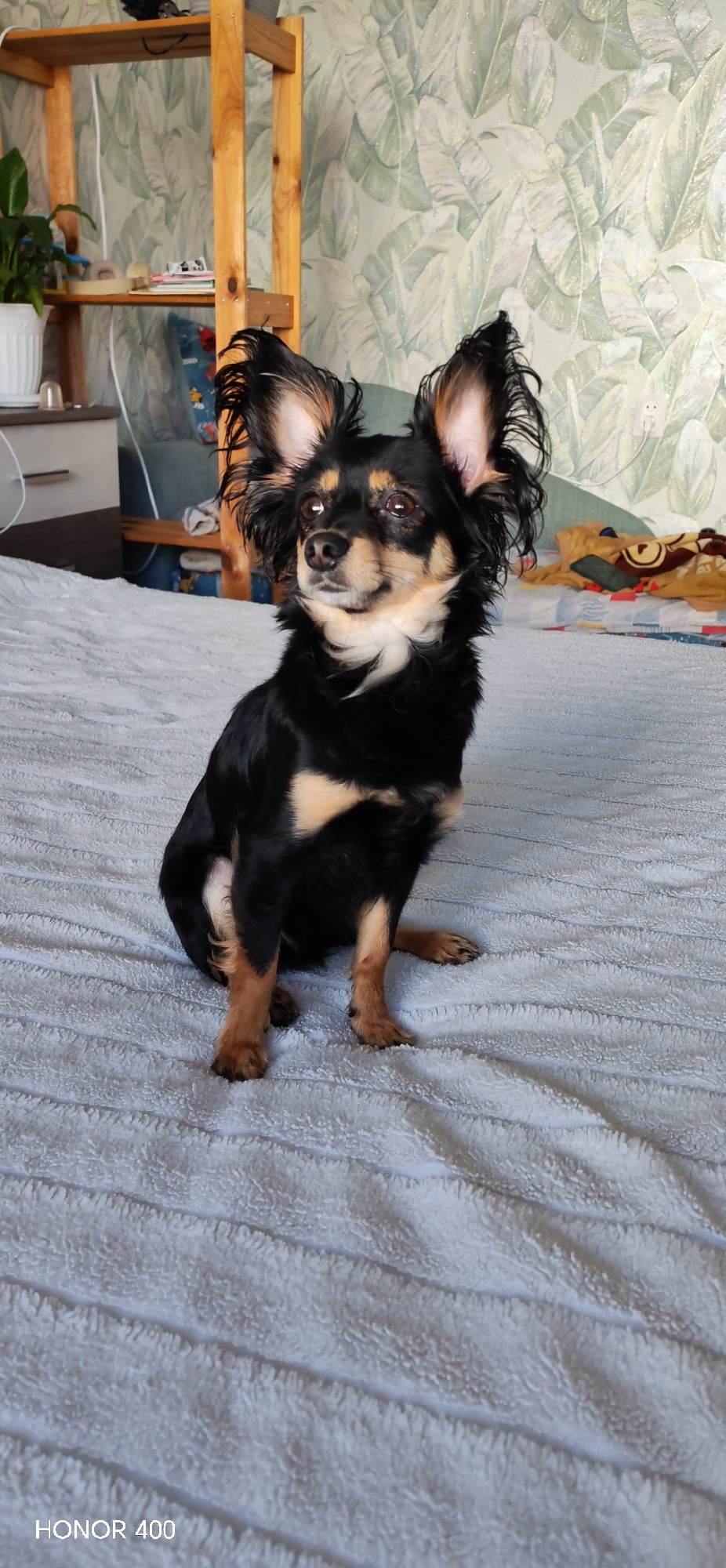 A black and tan Russian Toy Terrier sits on a light gray blanket. The dog is sitting upright and looking slightly to the left. The background includes a wall with a banana leaf pattern and a wooden sh…read more