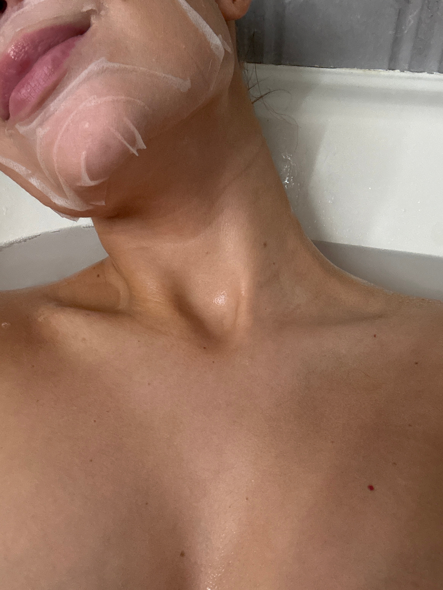 A close-up shot shows a person's face partially covered with a white, creamy substance, possibly a face mask or shaving cream. The person's lips are visible, and they appear pink. The person's shoulde…read more