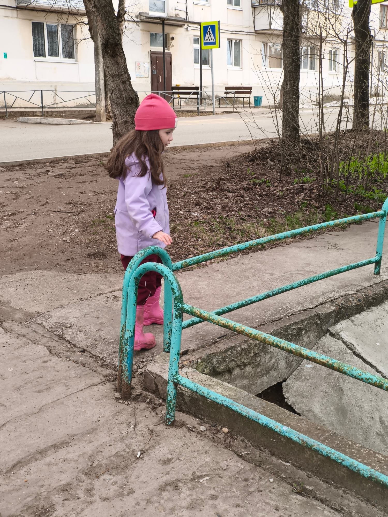 A young girl stands in an outdoor, urban setting, observing her surroundings. She is positioned on a concrete path next to a low, turquoise-painted metal railing that shows signs of rust and wear. The…read more