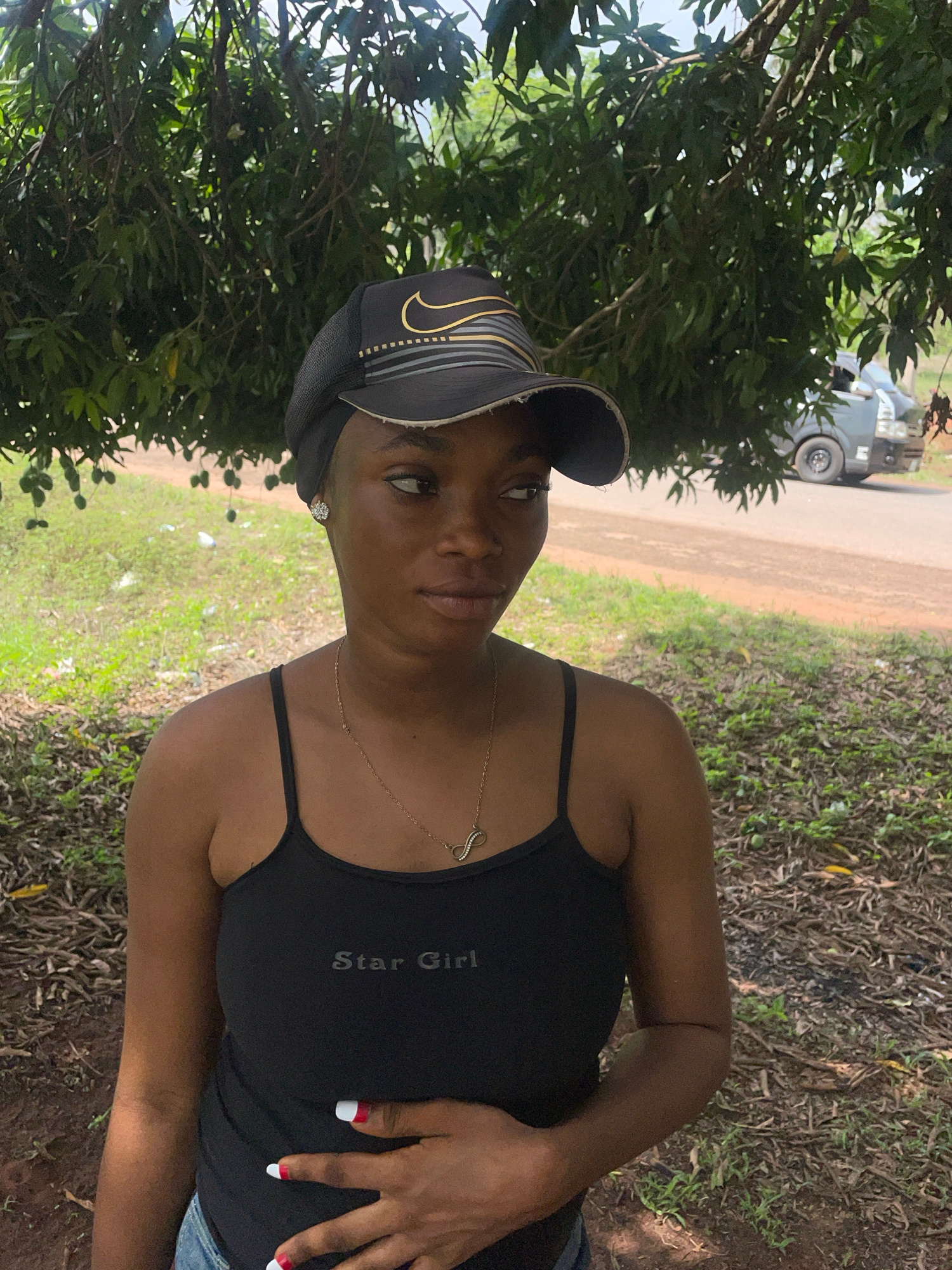 A woman stands in an outdoor setting. She wears a black tank top with "Star Girl" printed on it, a gold necklace, and a black cap. The surrounding environment includes trees, grass, and brown foliage…read more