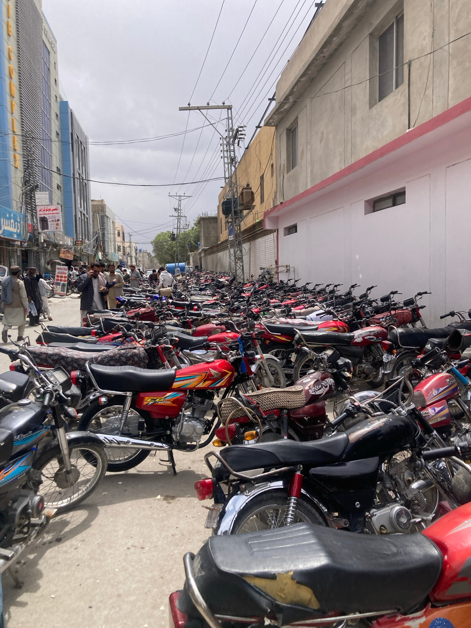 The image depicts a dense concentration of motorcycles parked on a concrete surface in an urban environment. A group of men are standing among the motorcycles. The background reveals buildings, power…read more