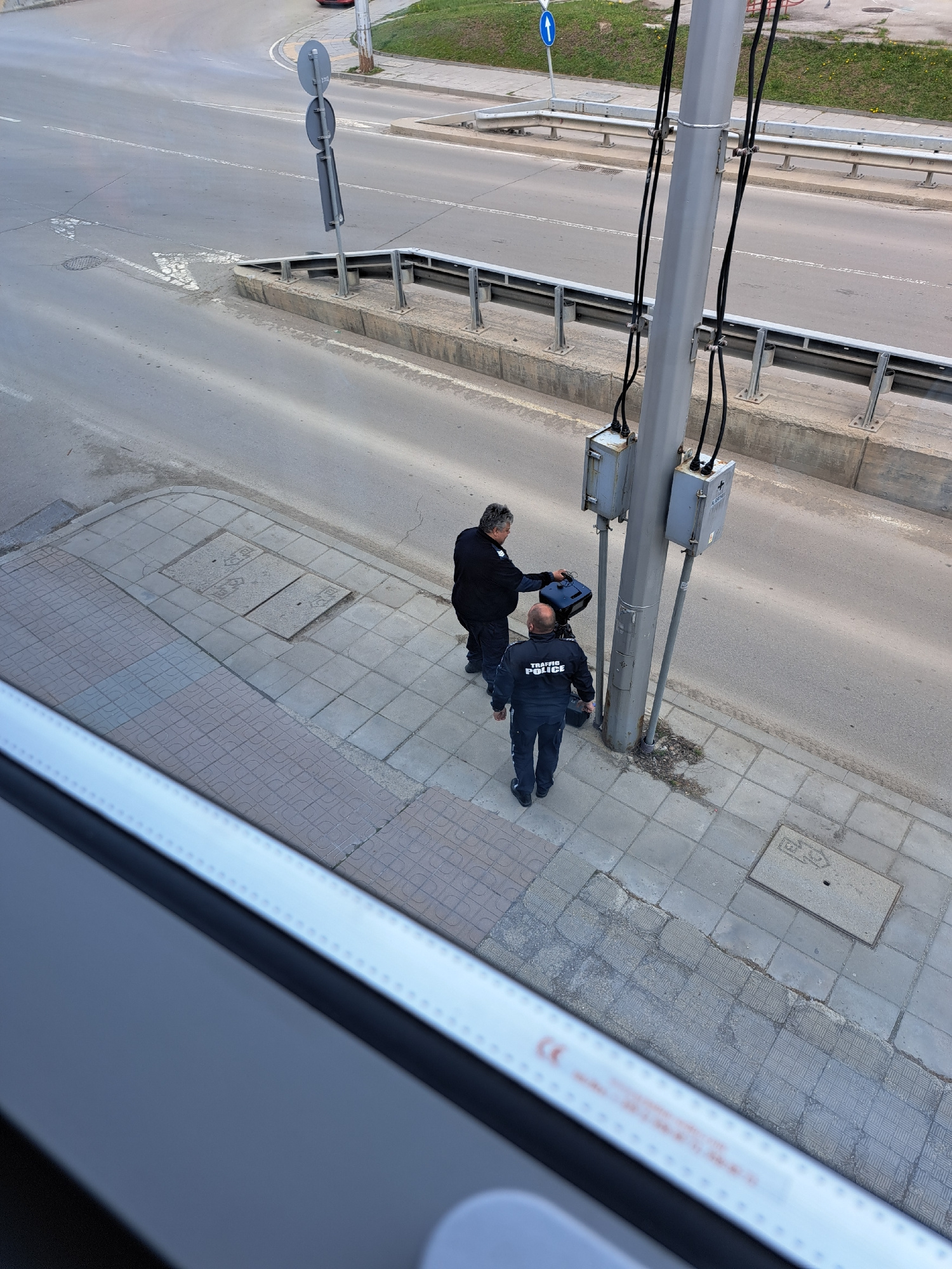 The image, taken from an elevated, oblique perspective, shows two men on a tiled sidewalk next to a street in Sofia, Bulgaria. The lighting suggests it is daytime, possibly late afternoon or an overca…read more