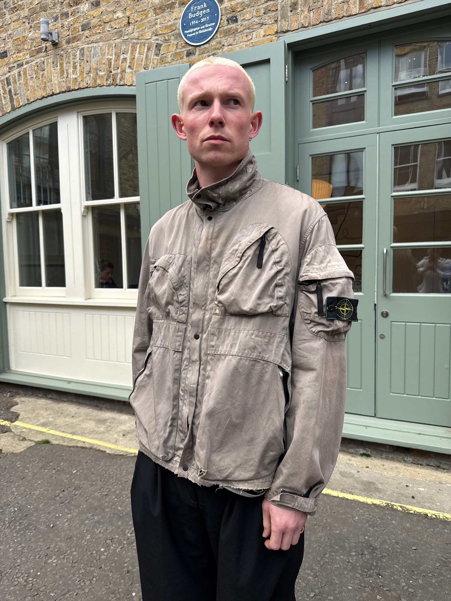 A young man with short, bleached blonde hair and light-colored eyes stands outdoors, posing for a photograph. He has a neutral expression and looks directly at the camera. He is wearing a light browni…read more