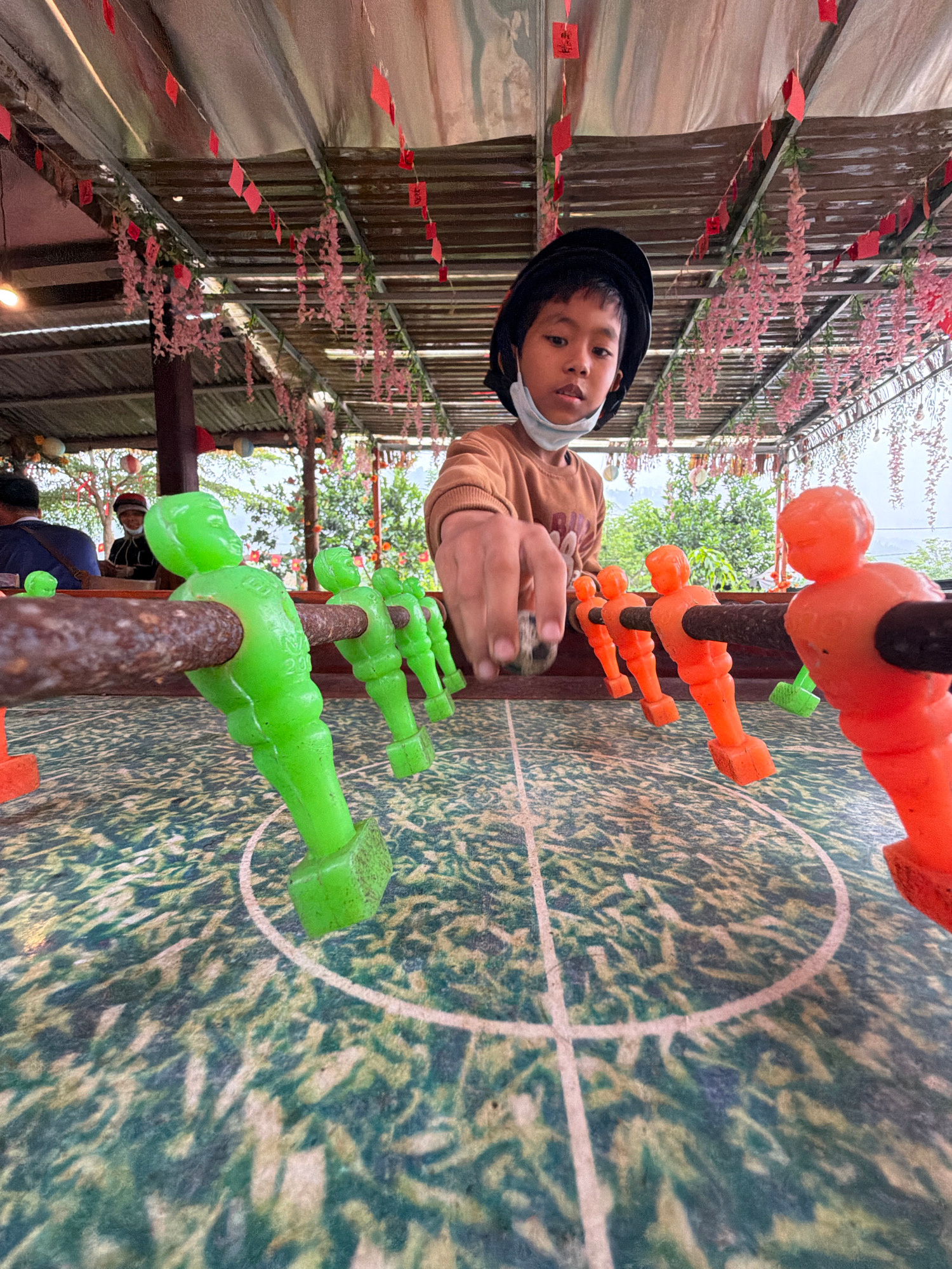 A child wearing a brown sweater, black hat, and a white surgical mask is playing foosball inside a covered outdoor structure. The foosball table features green and orange player figurines. The table h…read more