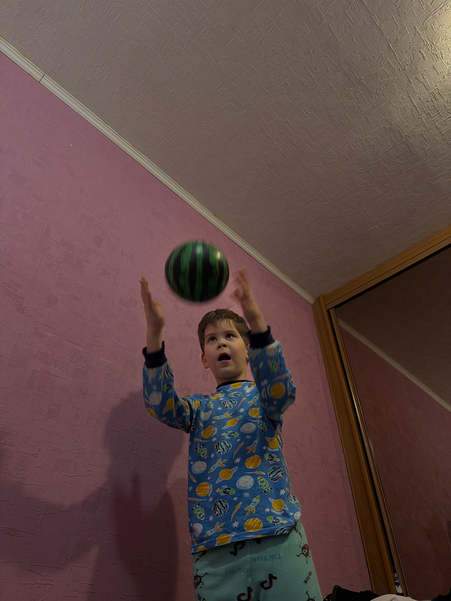 A child in blue pajamas with space-themed patterns is playing with a green and black striped ball in a room with pink textured walls. A mirror frame is visible in the background. The location is Perm,…read more