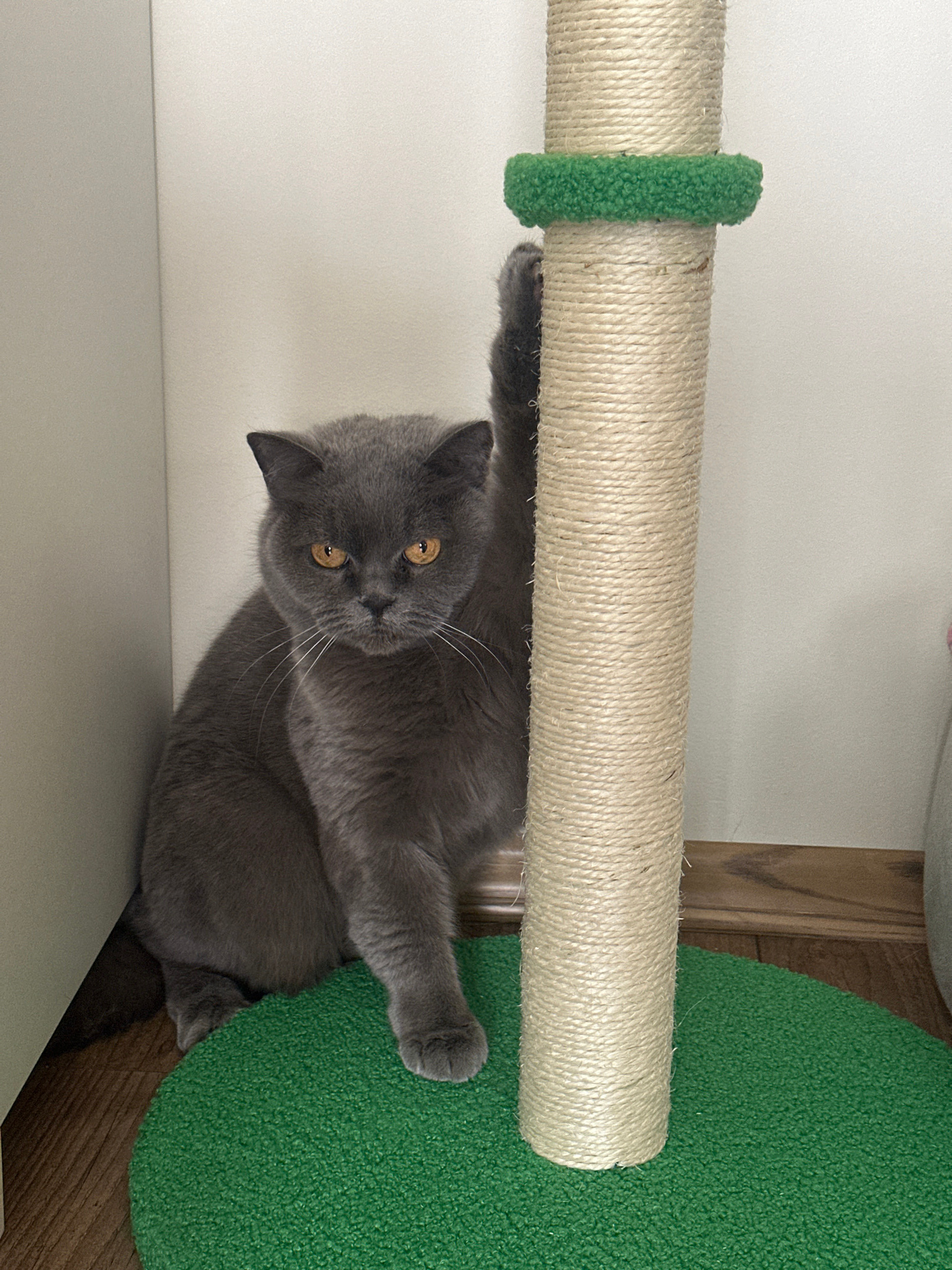 A gray British Shorthair cat lies beneath a sisal-wrapped scratching post, its paws gripping the post. The cat is positioned between a white wall and a green circular platform. The scene is indoors. T…read more