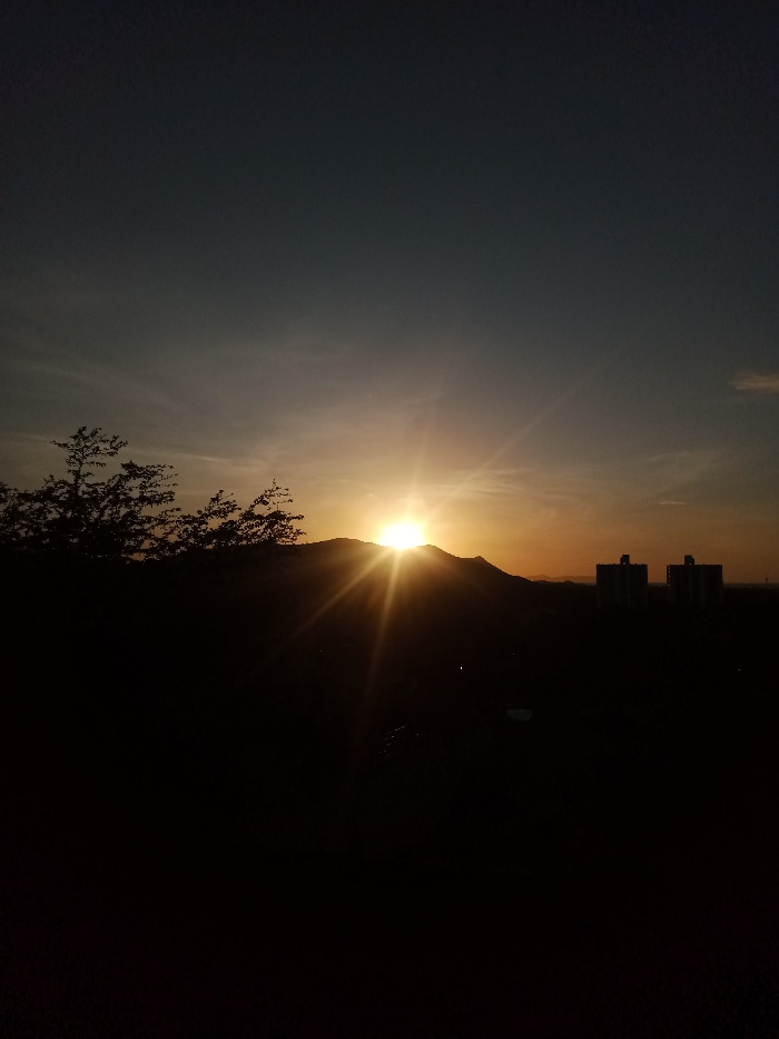 A vibrant sunset illuminates the horizon, its intense glow peeking over a silhouetted mountain range. The sky transitions from a deep blue at the top to a warm orange near the horizon. A dark tree lin…read more