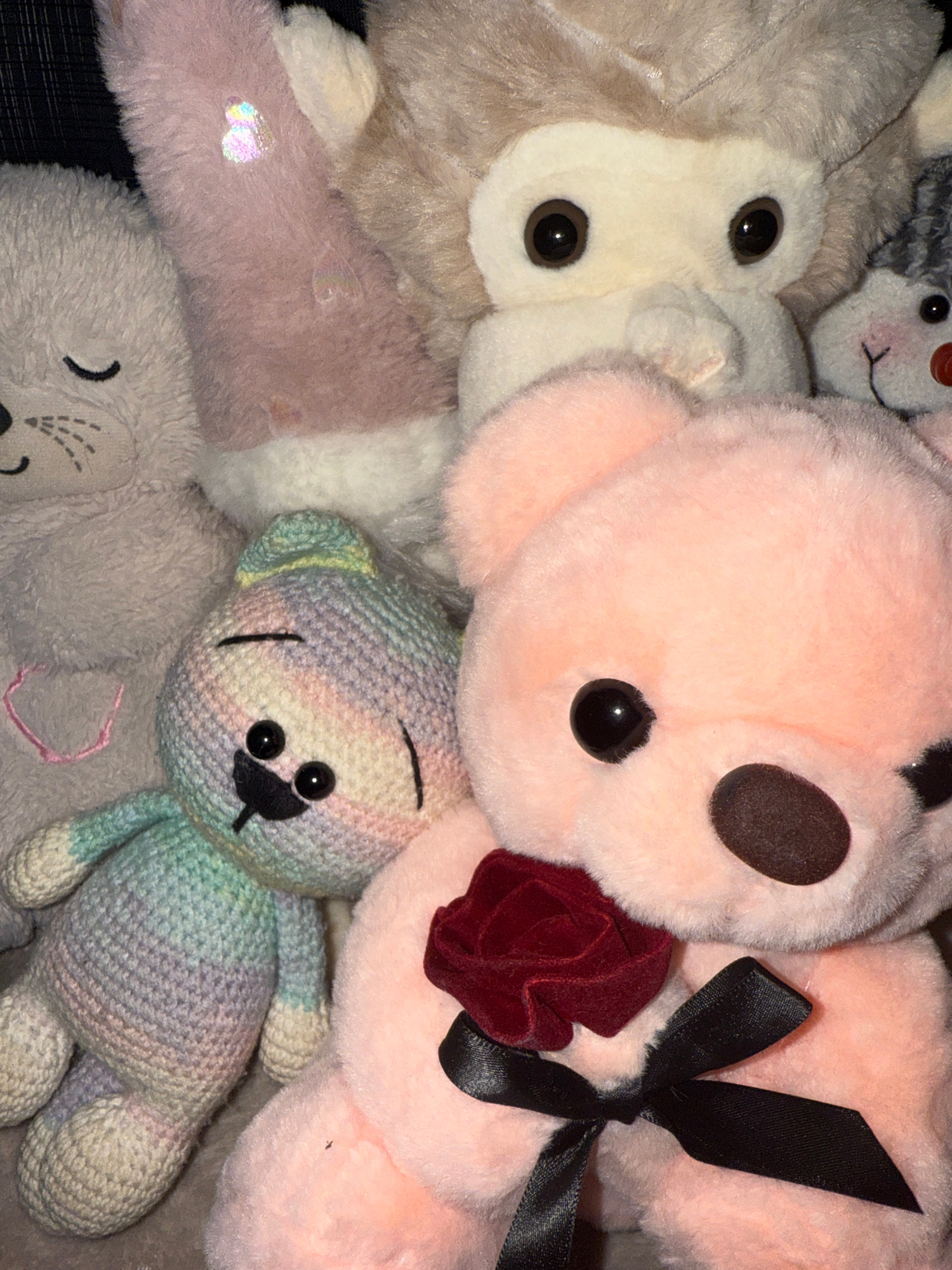 A close-up shot shows an assortment of stuffed animals. Dominating the scene are a pink plush bear with dark eyes and a large dark nose, adorned with a red fabric rose and a black ribbon. Below the pi…read more