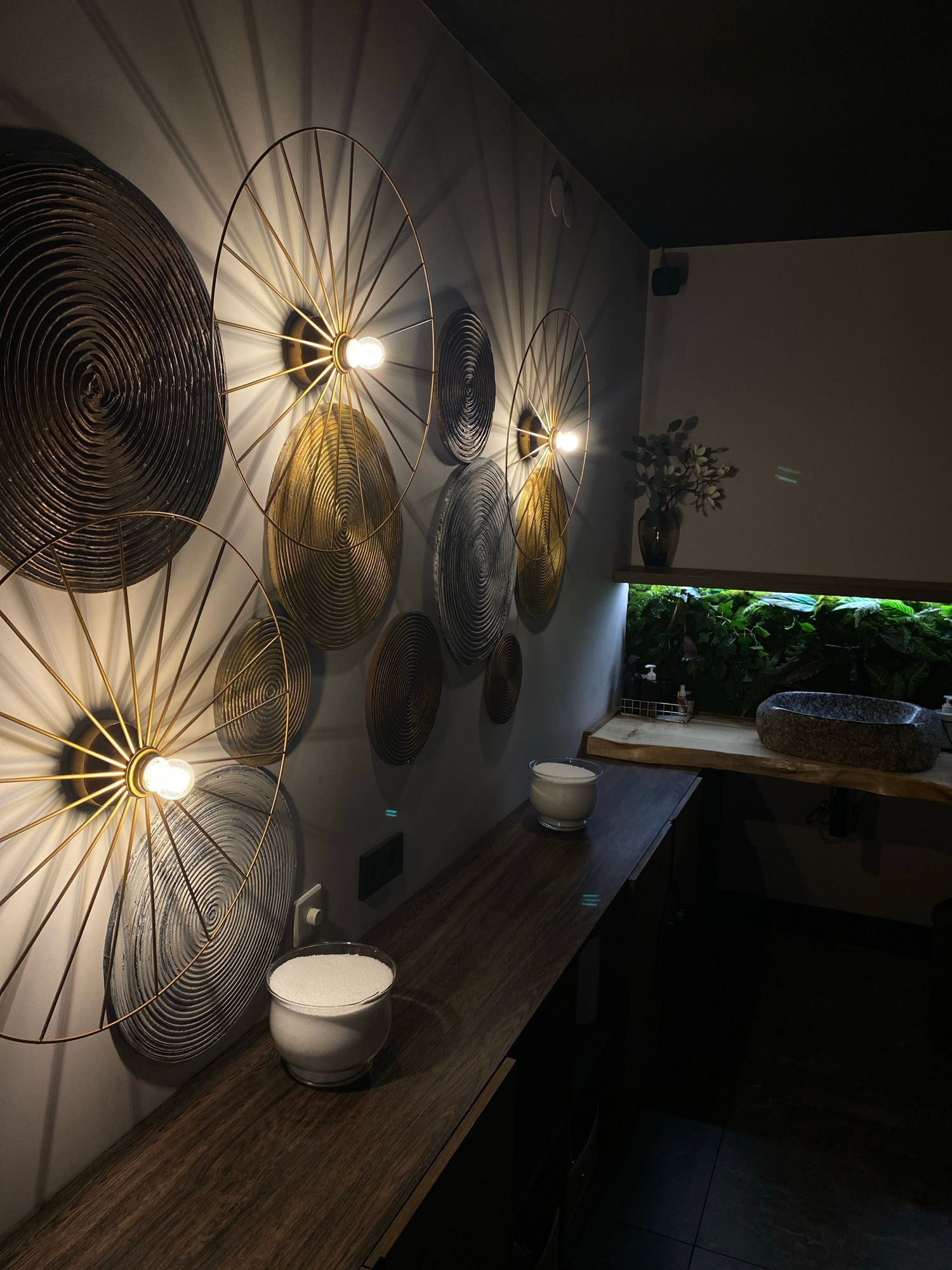 The image shows an interior with decorative elements on a light-colored surface. There are several circular designs with a radiating spoke pattern, some lit with a central bulb. Adjacent to the decora…read more