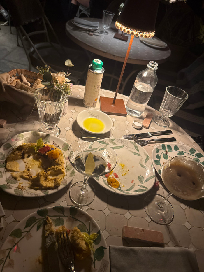 The image depicts an outdoor dining table at Lubàr restaurant in Milan, Italy, captured during the evening or night under localized artificial light from a table lamp with a dark, beaded shade. The table has a light-colored, square-tiled surface. Multiple white plates, each branded "LUBAR" with a green leafy design, show remnants of consumed food; one plate holds a largely eaten savory tart or galette with colorful toppings and a metal fork, while another contains scattered red and yellow food particles. A woven basket of bread is visible, alongside a tall can of "Lubàr" branded olive oil with a green dispenser cap and a small white bowl containing olive oil. Beverages include a clear martini-style glass with a lemon twist, a stemmed glass holding a frothy, light-brown opaque drink, a clear glass bottle of water, and two ribbed clear drinking glasses (one full of water, one empty). A set of cutlery (knife and fork), a small floral arrangement, a folded grey napkin, and a small rectangular light-colored block object are also present on the table. No individuals are visible. | Open Wire