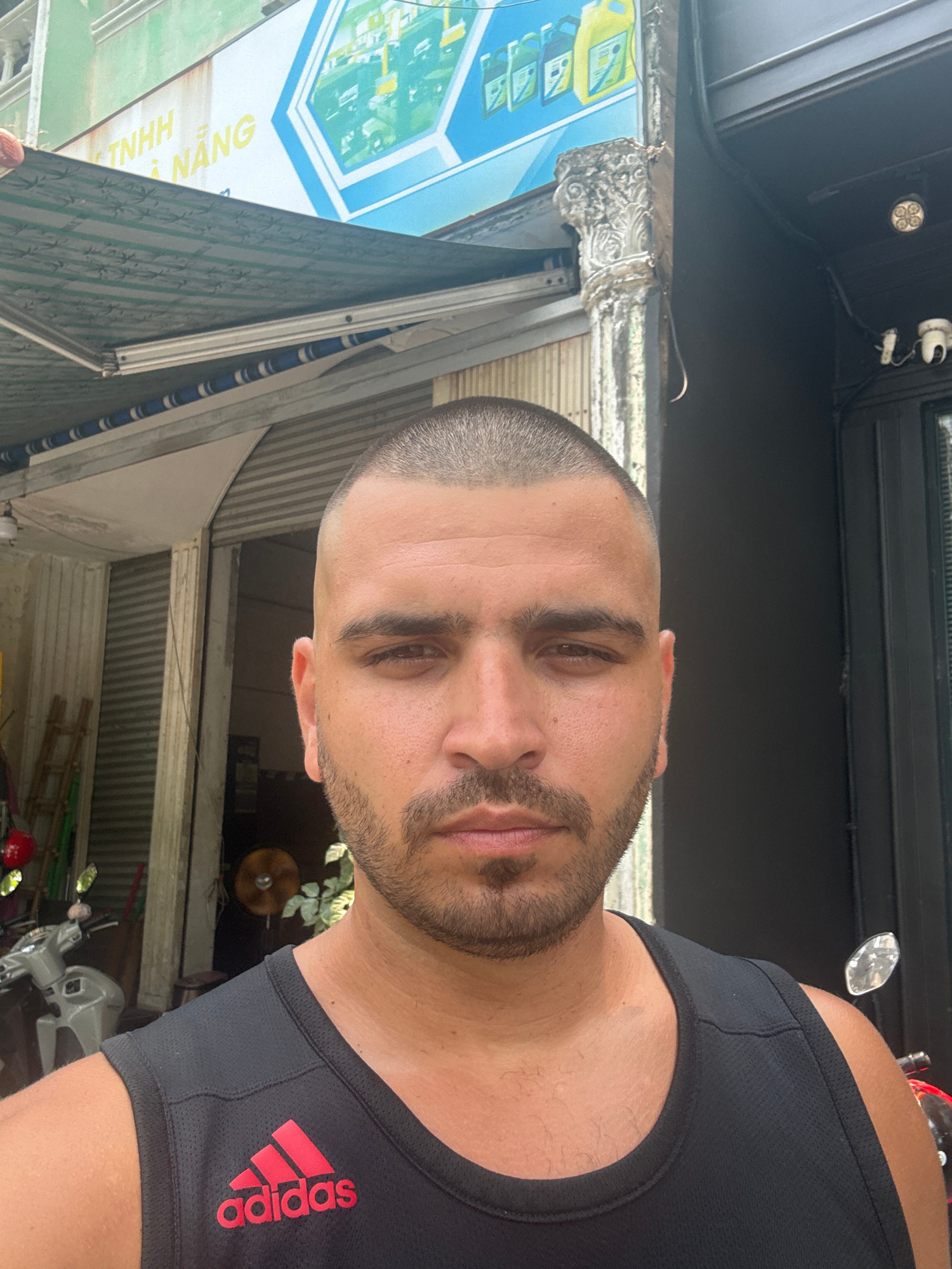 A medium close-up angled self-portrait shows a man with a shaved head, brown eyes, and a trimmed beard wearing a black Adidas tank top. The background suggests an outdoor setting. An awning with blue…read more