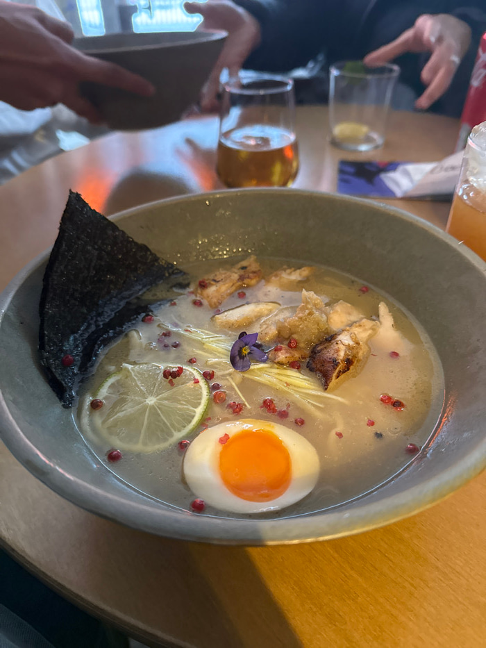 The image depicts an indoor dining scene at Ramen Beograd (Ramen to je ljubav) located at Dobračina 59b, Dorćol, Belgrade, Serbia. The primary subject is a large, light grey ceramic bowl filled with r…read more
