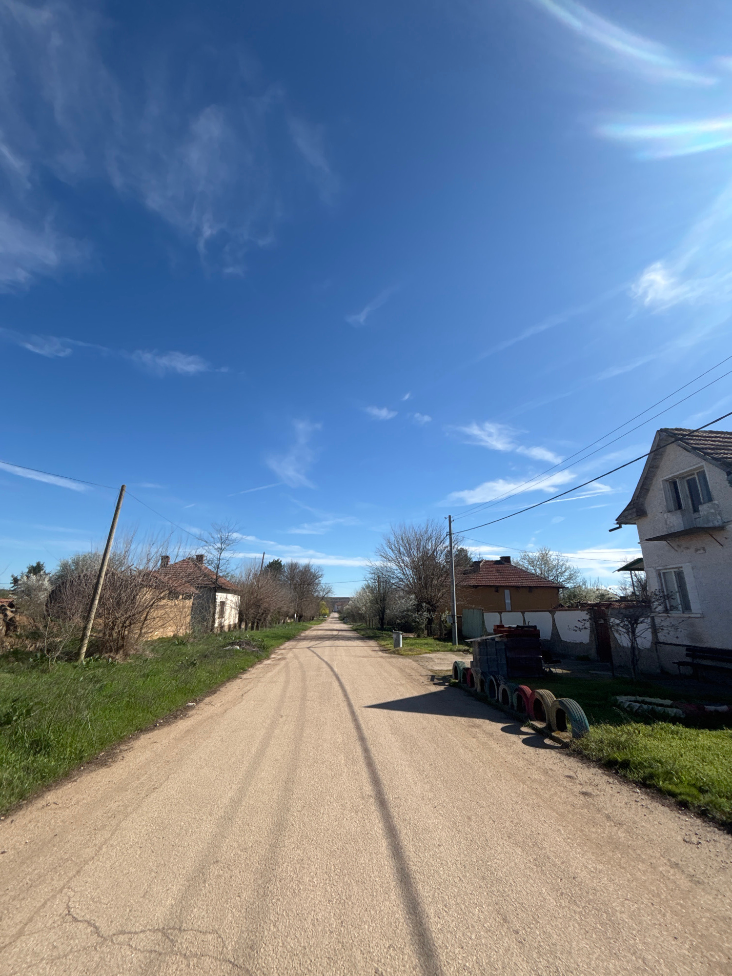 The image depicts a rural street scene in Lehchevo, Bulgaria. The road is unpaved, with grass and some bare trees lining the right side. Houses are visible on both sides of the street, some appearing…read more
