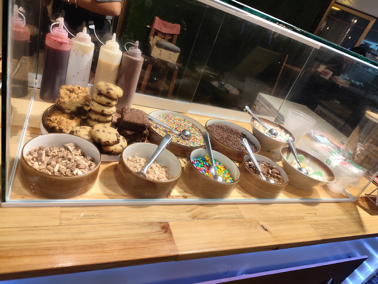 The image depicts a dessert topping and baked goods display counter located in Los Robles, Venezuela. The counter features a light-toned wooden surface, with a subtle blue under-lighting visible at it…read more