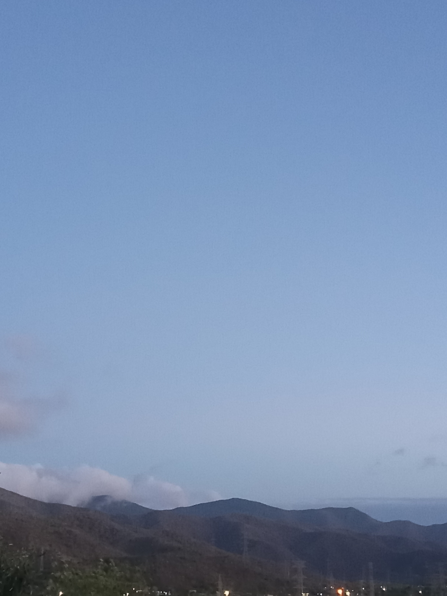 The image captures a twilight or dusk scene in a hilly or mountainous region, potentially near Altagracia, Venezuela. The sky occupies the majority of the frame, exhibiting a gradient from a lighter blue towards the top to a slightly darker hue closer to the horizon. The horizon is defined by a series of overlapping mountain ridges, which appear dark and silhouetted against the fading light. Some low-lying clouds are visible, partially obscuring the peaks of some of the mountains. In the foreground, a dark, indistinct mass suggests vegetation and possibly urban infrastructure, including faint lights that might be from streetlights or buildings. The overall impression is one of a peaceful, natural landscape transitioning into night. | Open Wire