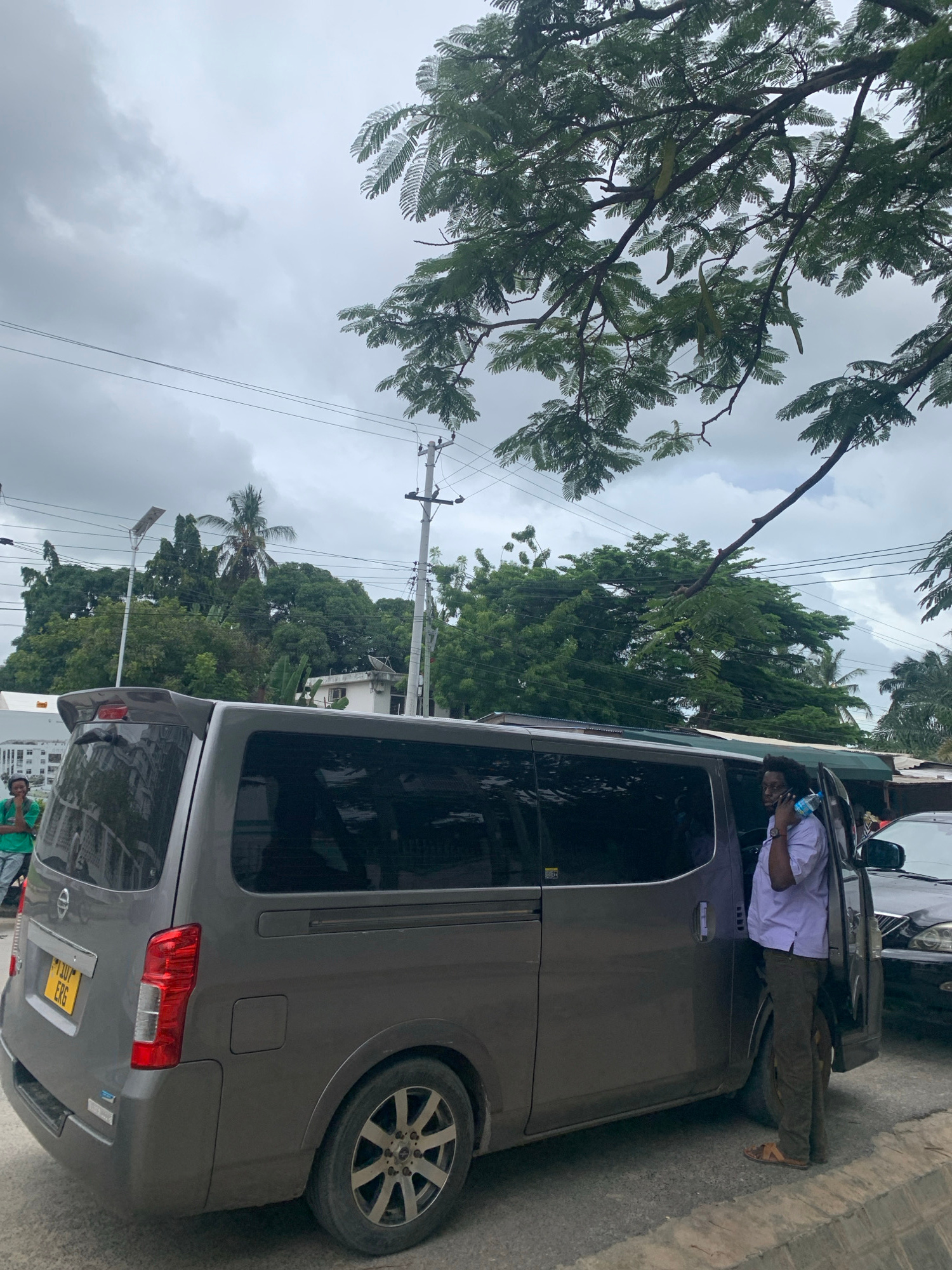 The image shows a gray van parked on a street in Dar es-Salaam, Tanzania. A man wearing a white shirt and brown pants is leaning into the open driver's side door. The van has a yellow license plate wi…read more