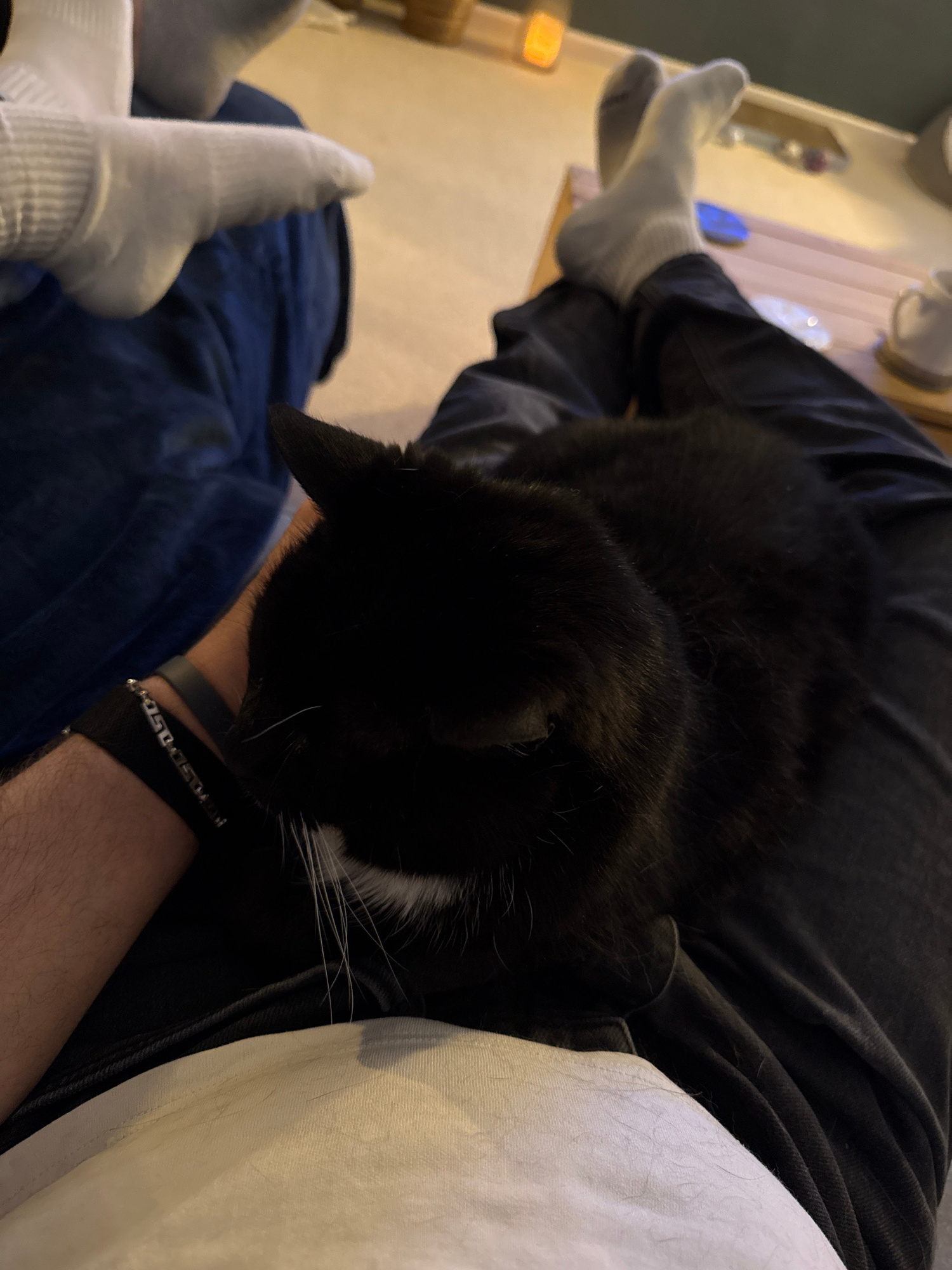 A black cat is lying on a person's lap. The person is wearing black pants and grey socks. A blue blanket is also visible on the person's lap. The person is wearing a black watch and a silver bracelet.…read more