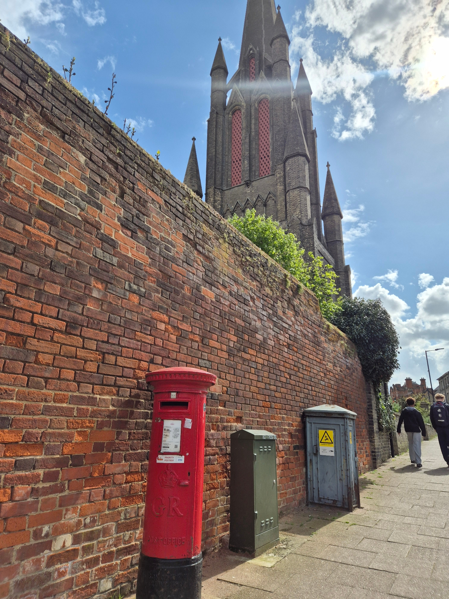 The image shows a red cylindrical British Royal Mail post box attached to a tall brick wall in Bury St Edmunds, West Suffolk, United Kingdom. The wall rises sharply upwards and to the left of the fram…read more