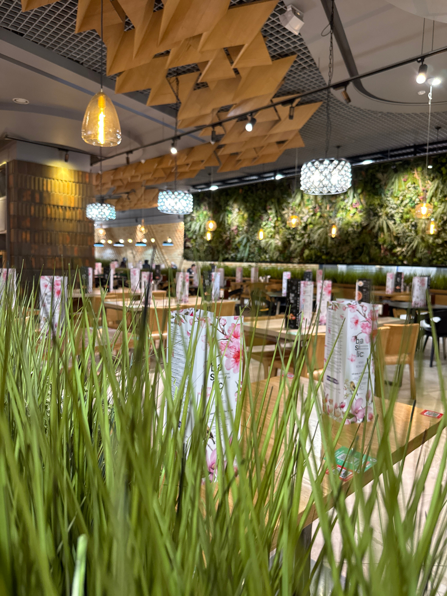This media file captures the interior of a contemporary restaurant or cafe in Almaty, Kazakhstan, presented from a perspective that features dense, artificial green foliage in the immediate foreground…read more