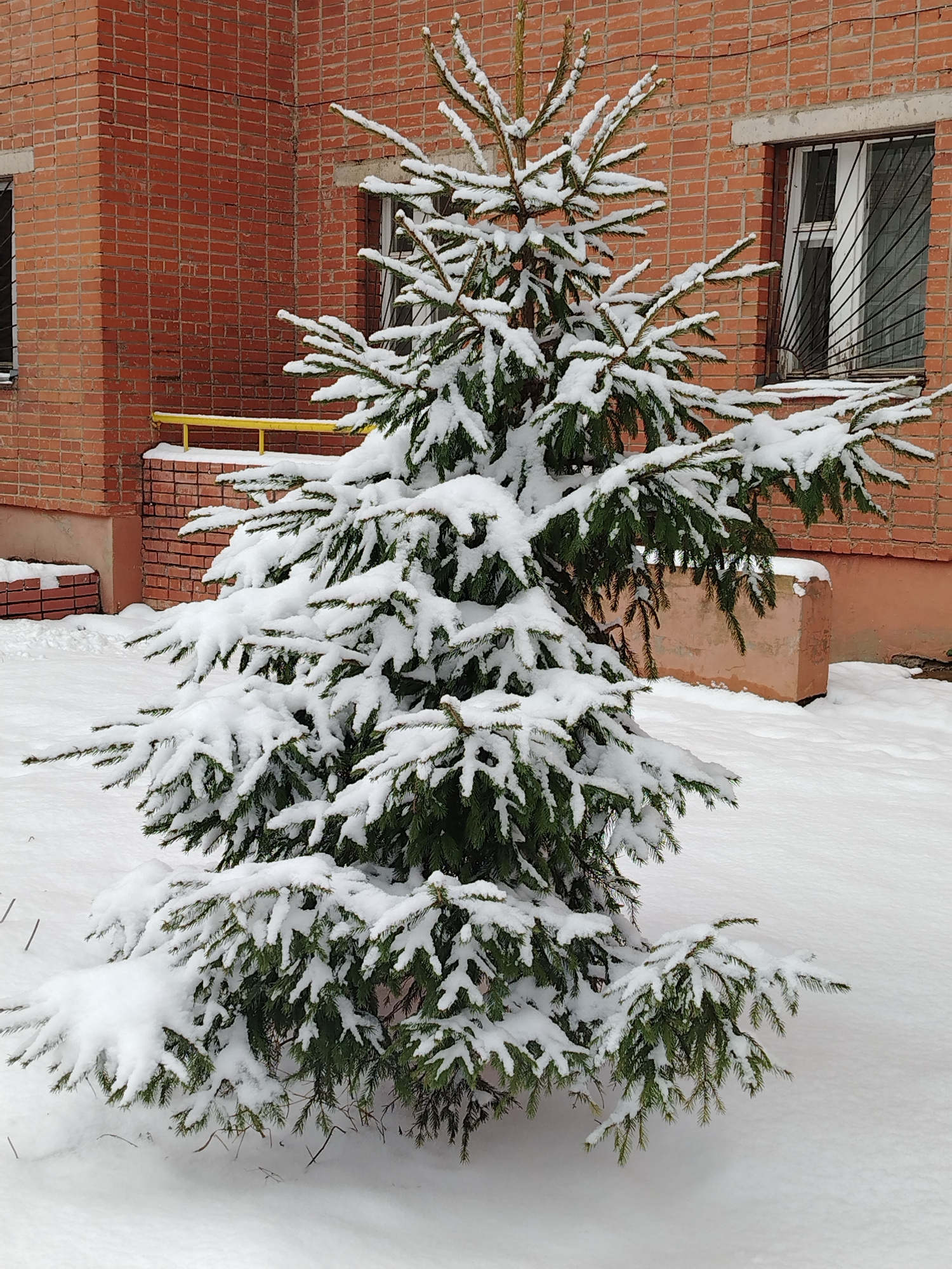 The image shows a snow-covered spruce tree in Izhevsk, Russia. The tree is in the foreground, with a red brick building in the background. The building has white-framed windows with bars. A yellow hanβ¦read more