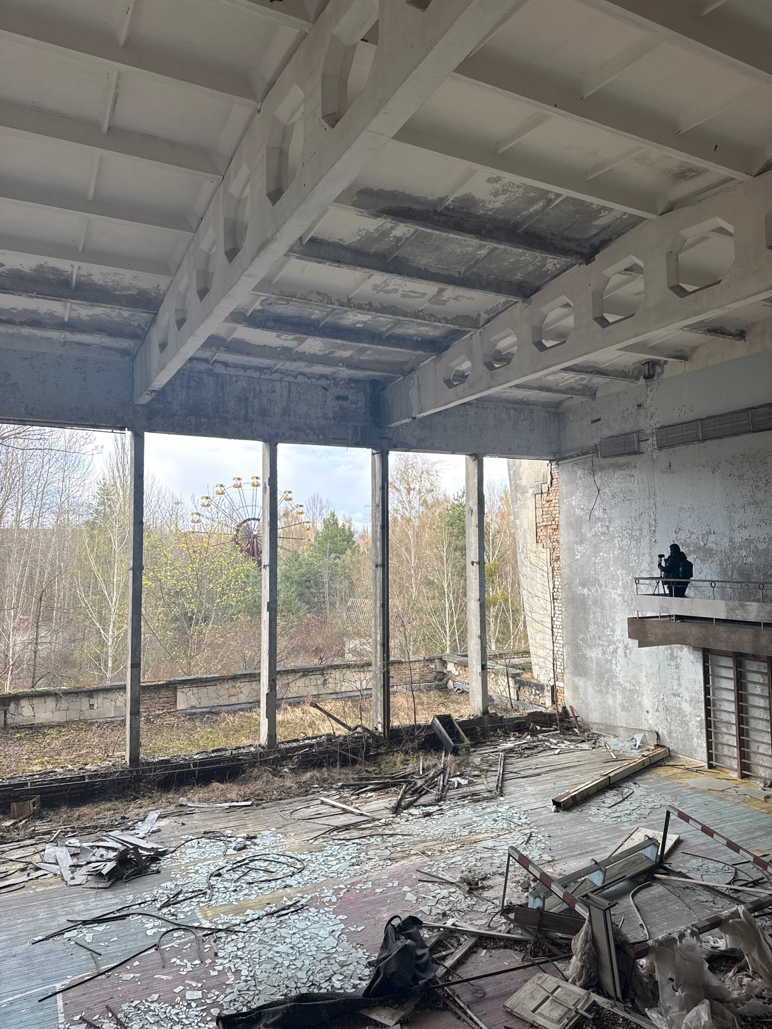 The image shows an interior view of an abandoned building in Pripyat, Ukraine, with a deteriorated basketball court floor covered in debris and shattered glass. Large windows offer a view of a Ferris…read more