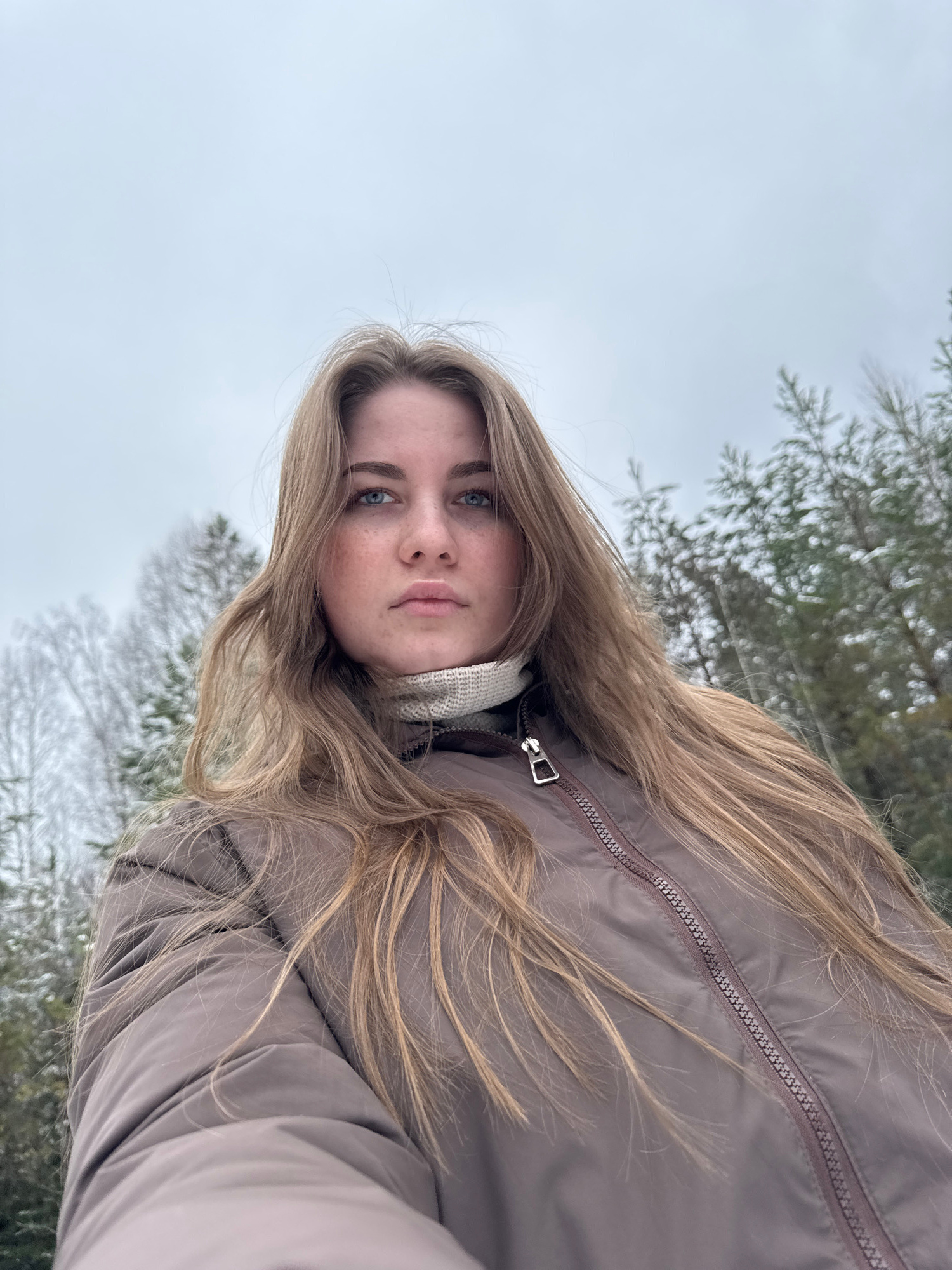A young woman is outdoors, presumably in the vicinity of Zavod Mikhailovskii, Russia. The environment suggests a winter setting, with trees visible in the background possibly covered in snow or ice. T…read more