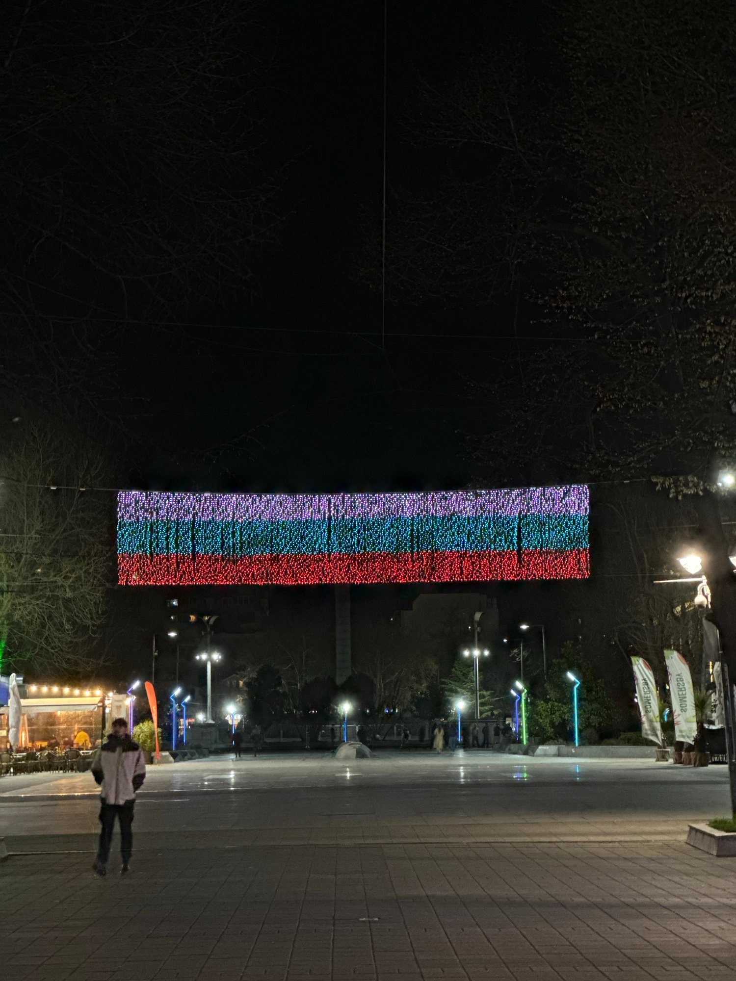 The image depicts a nighttime scene in Burgas, Bulgaria. A large, vertical light display reminiscent of the Bulgarian flag's colors (white, green, red) dominates the view. To the left, a dark expanse…read more