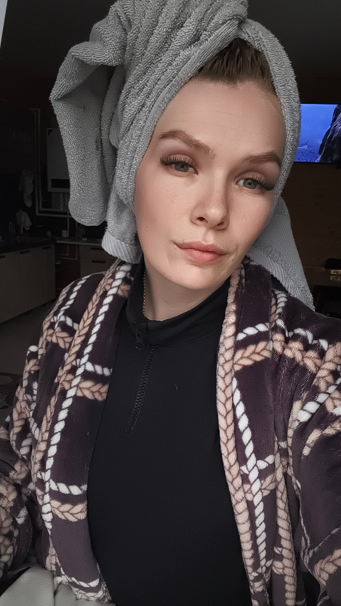 A portrait photograph features a young woman posing indoors, likely within a residential setting in Русский Вожой, Russia. She is shown from the chest up, looking directly at the camera with a calm, n…read more