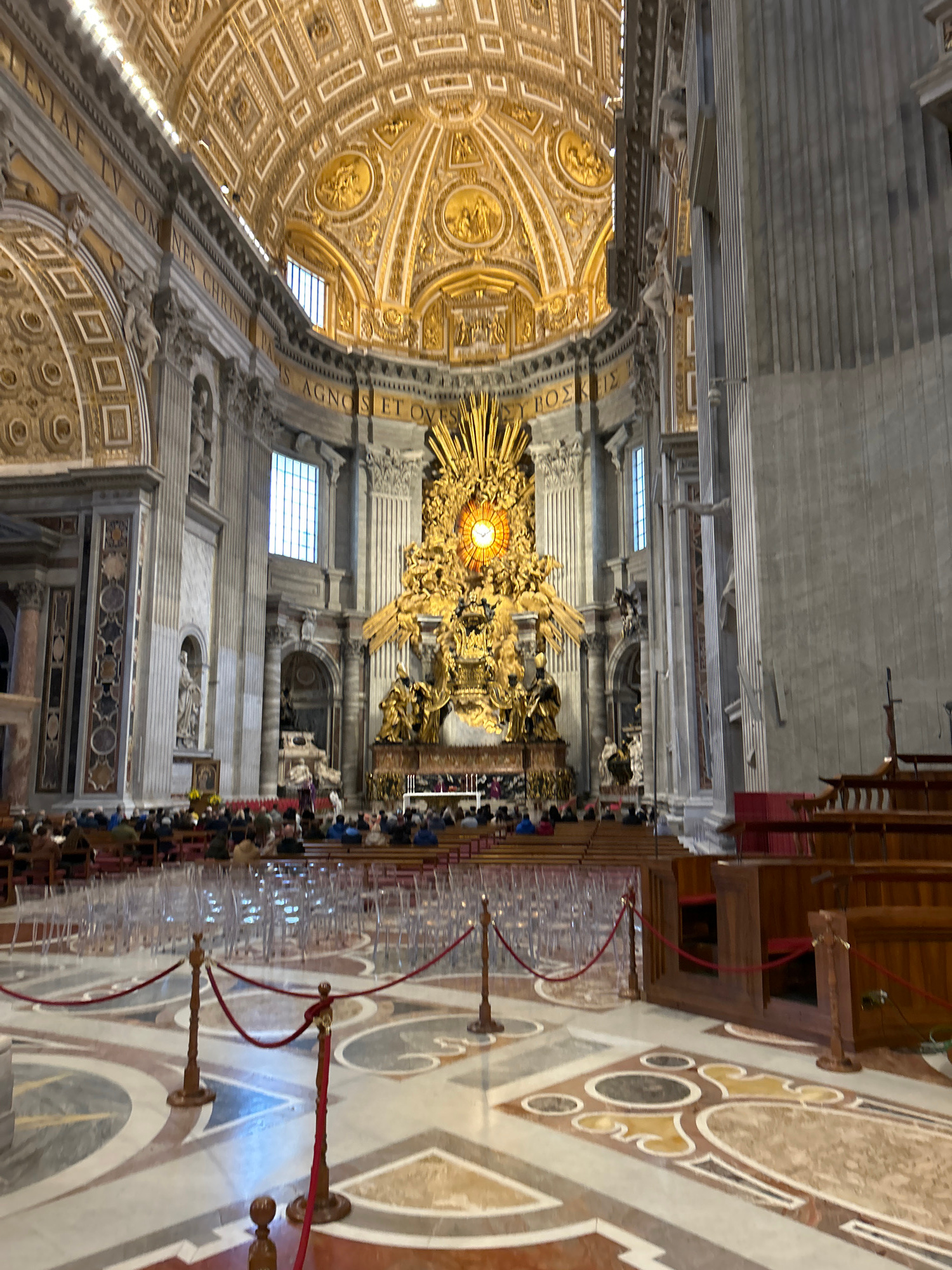 The image displays the interior of St. Peter's Basilica in Città del Vaticano, Vatican City, viewed from a middle-to-rear perspective, facing the apse. The central focus is the Cathedra Petri, a monum…read more