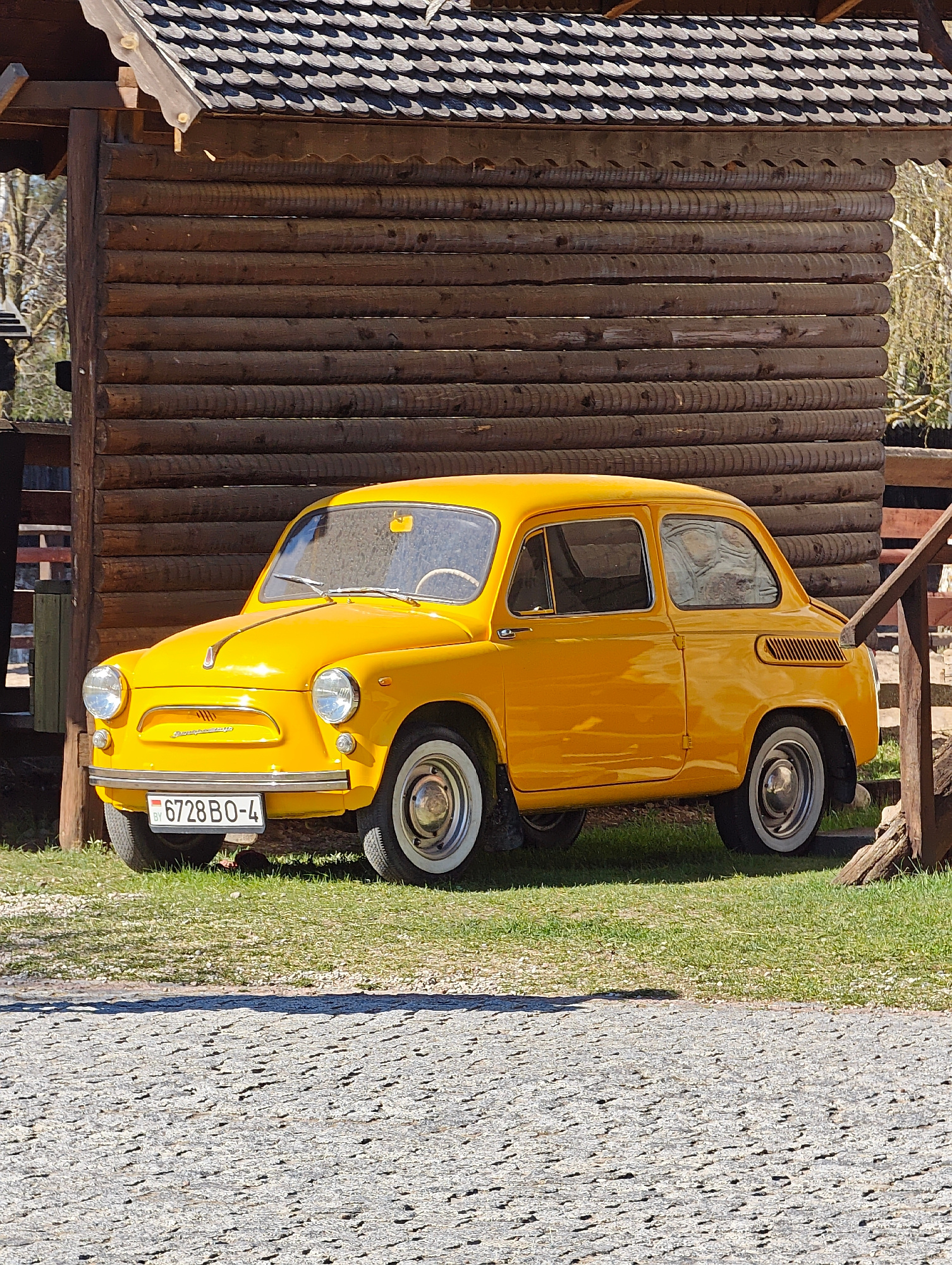 A yellow ZAZ-965 car is parked on a patch of grass beside a small log cabin-style structure. The car has white-walled tires and a license plate that reads "6728 BO-4" with the country code "BY". The l…read more