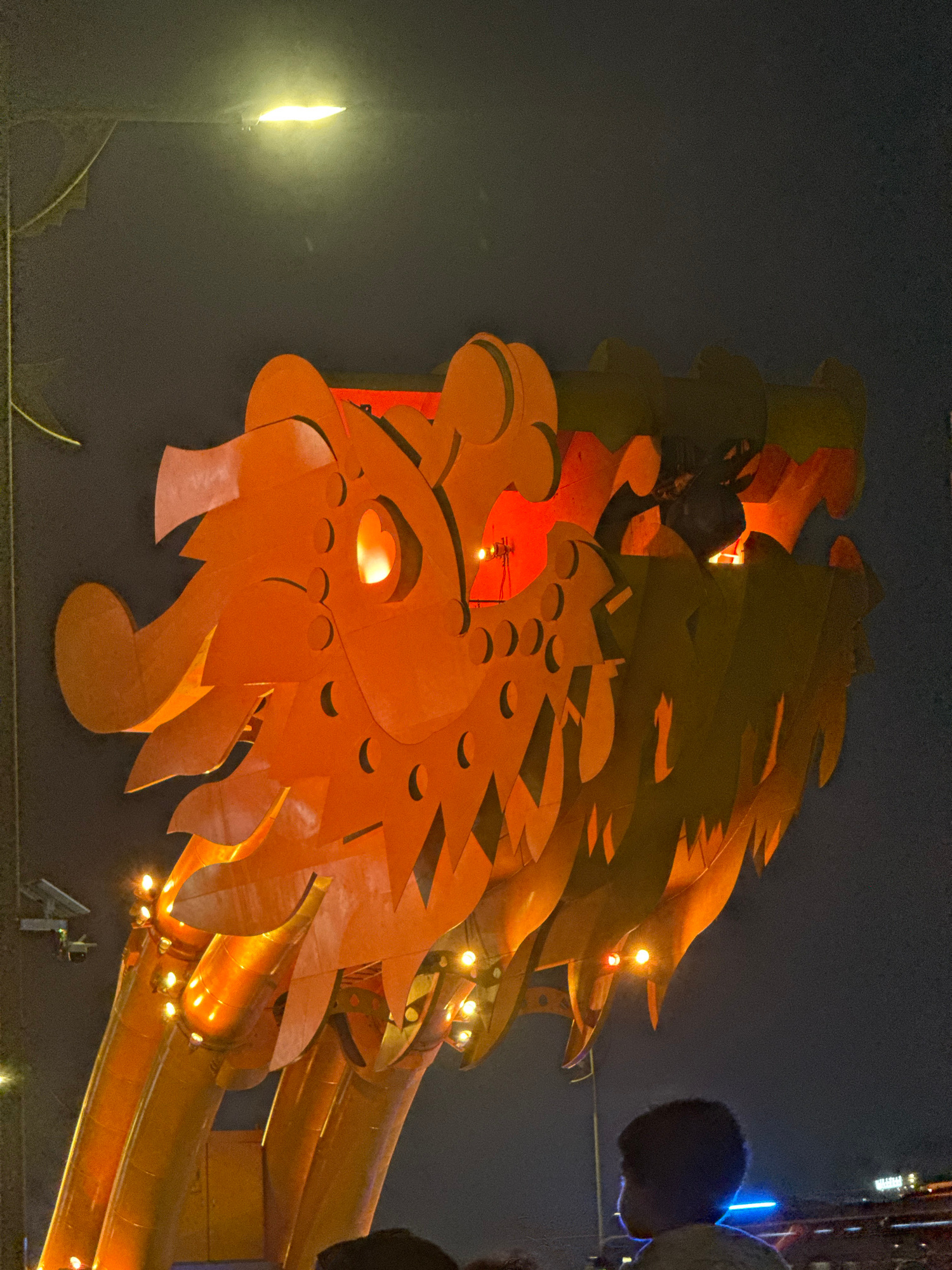 An eye-level, indoor shot captures a lit, lion head structure on a bridge in Đà Nẵng, Vietnam, at night. The lion's head is orange, with cut-out details and glowing lights. A street lamp appears on th…read more