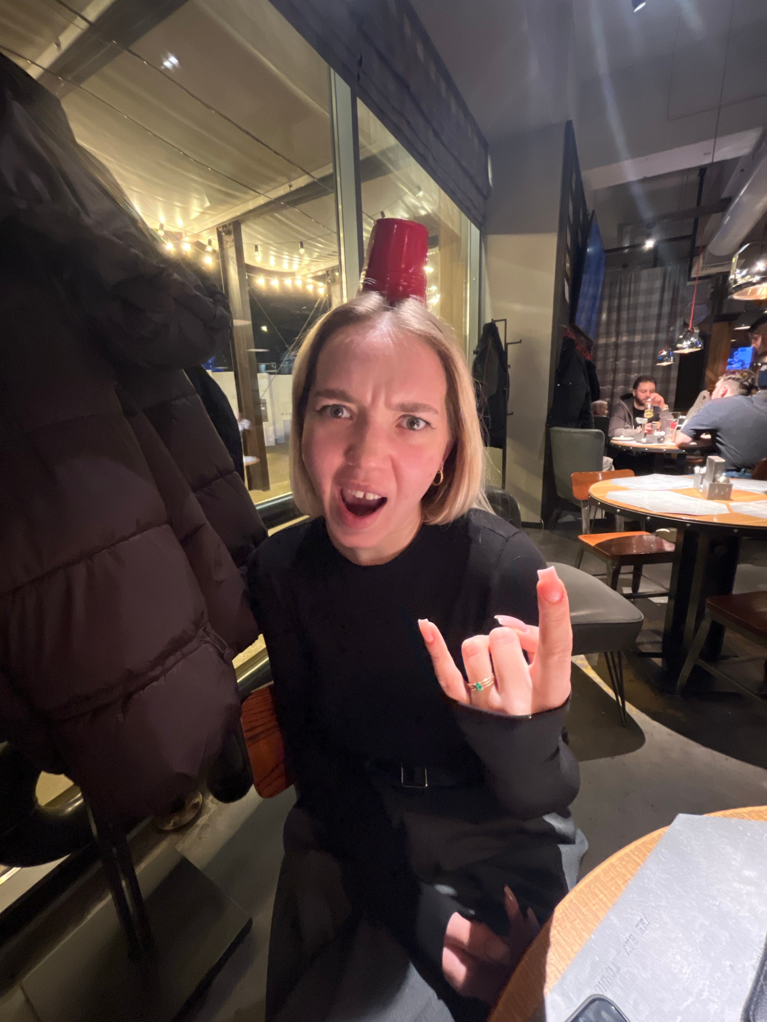 A woman poses in a restaurant. She has blonde hair and is wearing a black long-sleeved shirt. Her left hand is raised in a "rock on" gesture. In the background, other patrons are seated at tables. Theβ¦read more