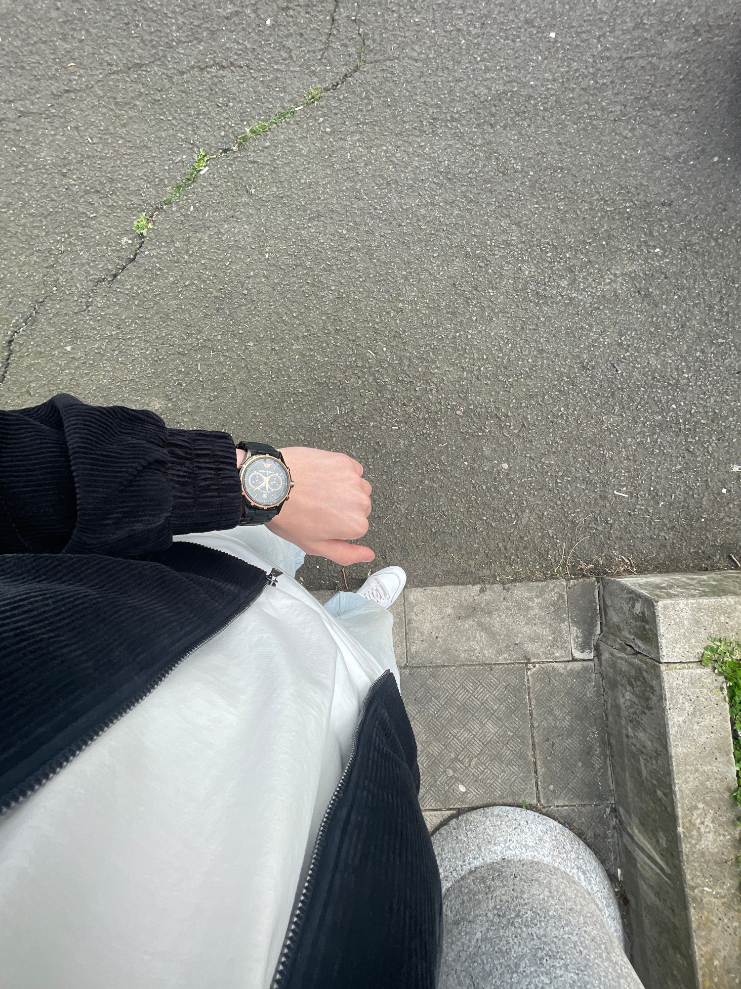 The image shows a first-person perspective looking down at a person standing on a paved surface, likely a sidewalk or road. The surface is gray and appears to be asphalt or concrete, with a crack runn…read more