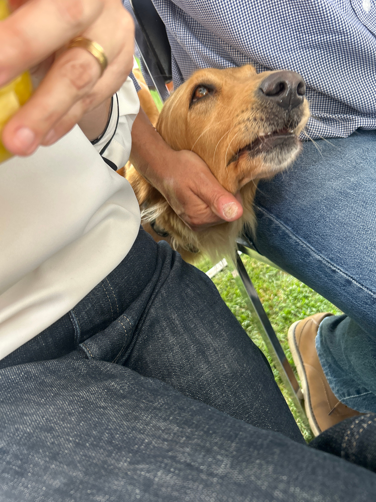 The image shows a close-up view of three people seated, likely outdoors. A golden retriever is nestled between two of the people, its head being held by one person. The people are wearing casual cloth…read more