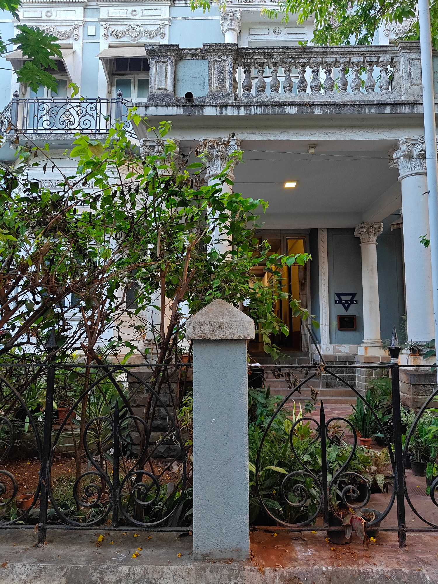 The image depicts a building in Mumbai, India. The structure has two stories, with the upper level featuring a balcony with an ornate metal railing and a balustrade. The building is painted a faded bl…read more