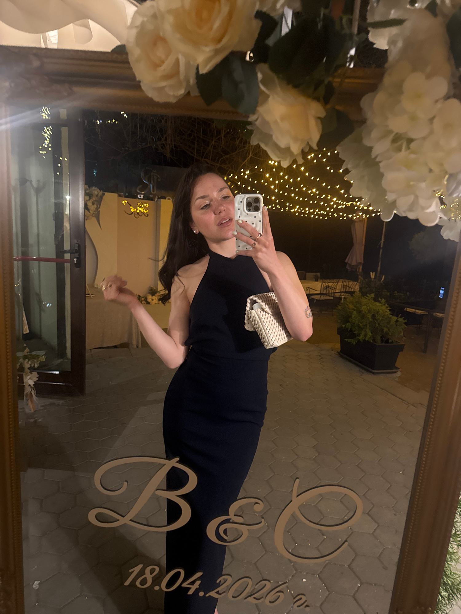 A woman takes a selfie in front of a mirror that reflects an outdoor event space in Blagoevgrad, Bulgaria. The mirror reflects her dark sleeveless dress, fair skin, and a small purse. The reflection b…read more