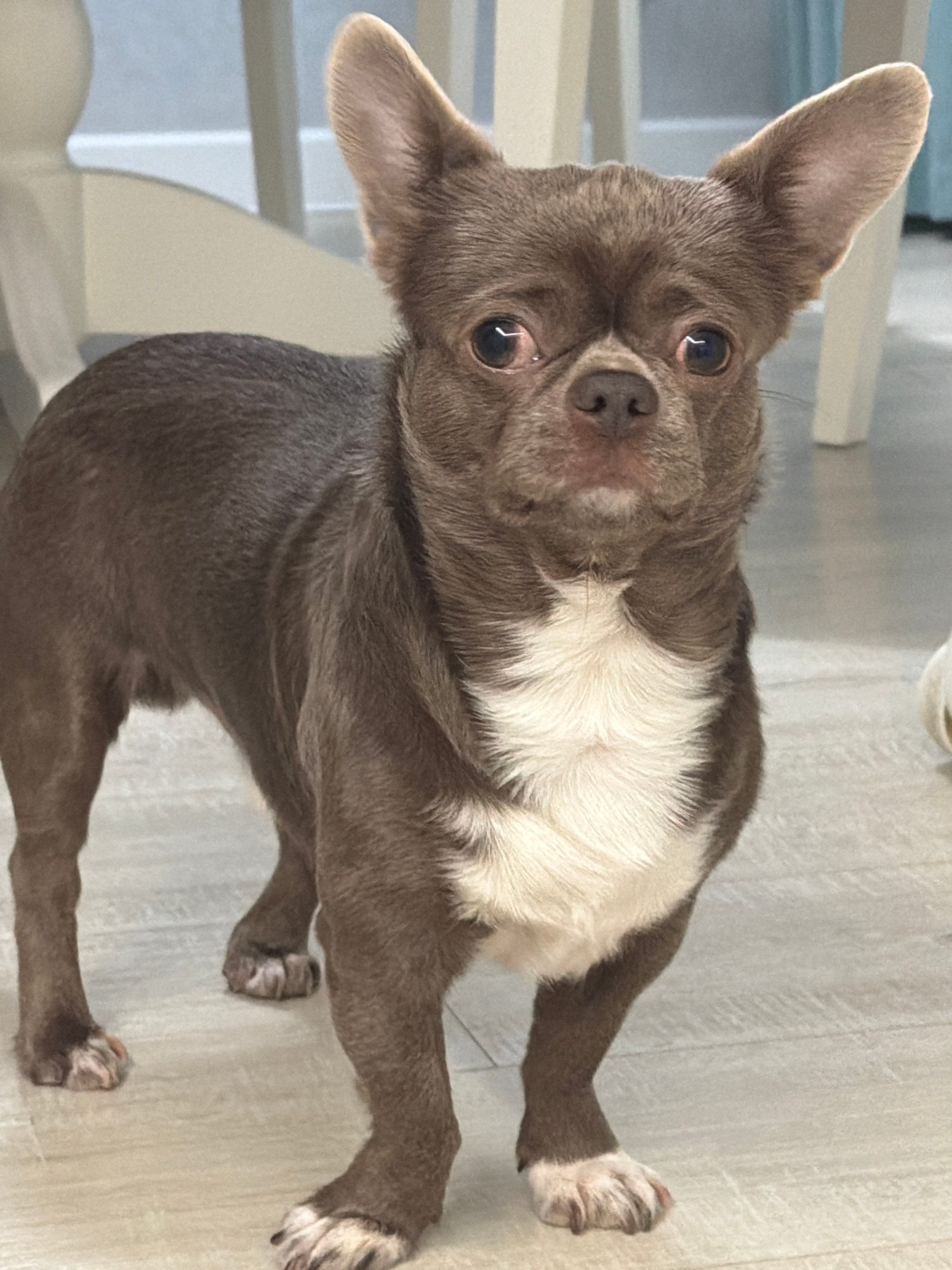 A small, gray and white short-haired dog is standing on a light-colored wooden floor. The dog is looking upwards towards the camera, with its head tilted to the left. The dog has large, pointed ears.…read more