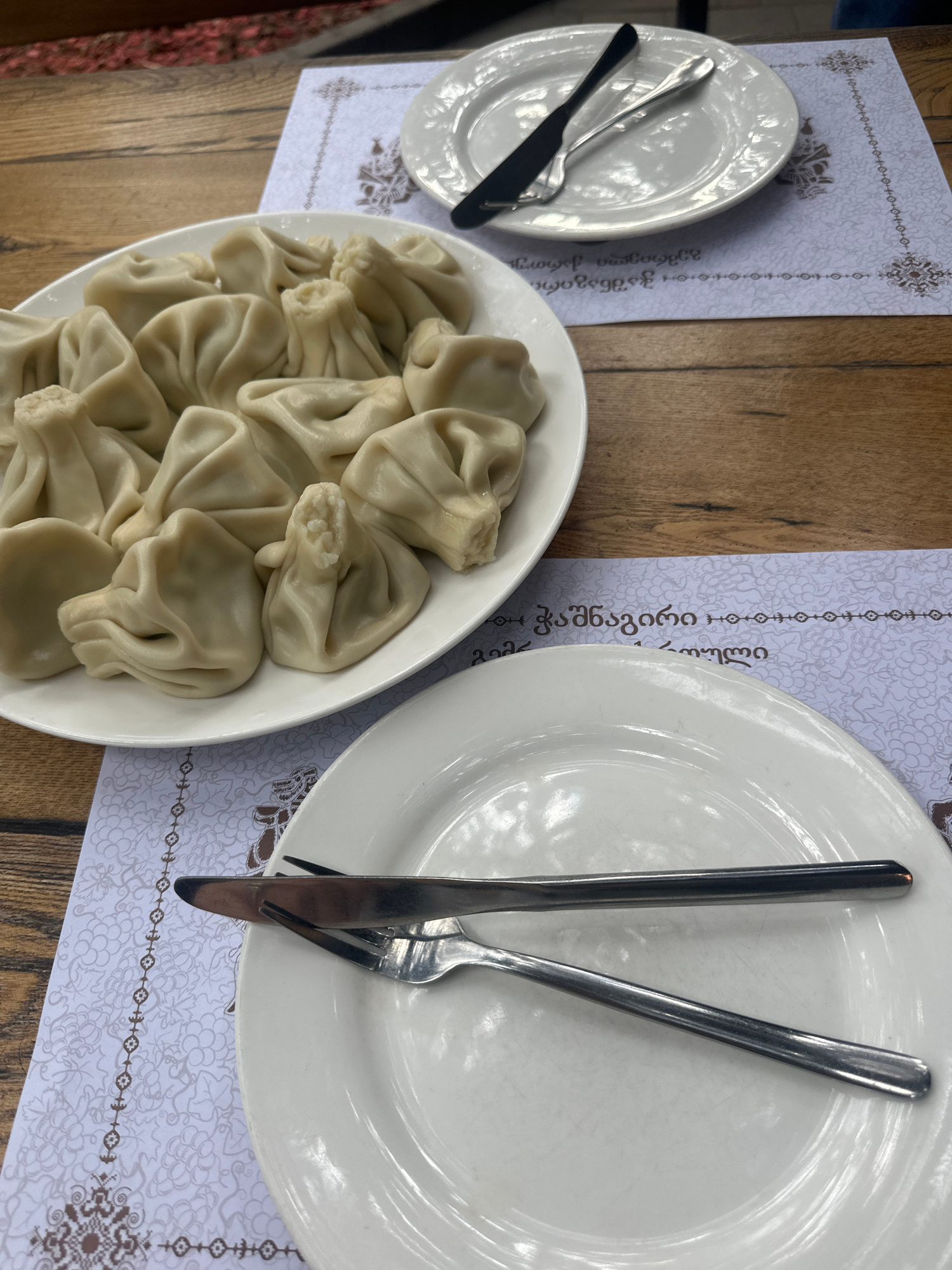 The image captures a table setting with Georgian dumplings, known as Khinkali, as the central focus. The dumplings are presented on a white plate, densely packed together, suggesting a generous servinβ¦read more