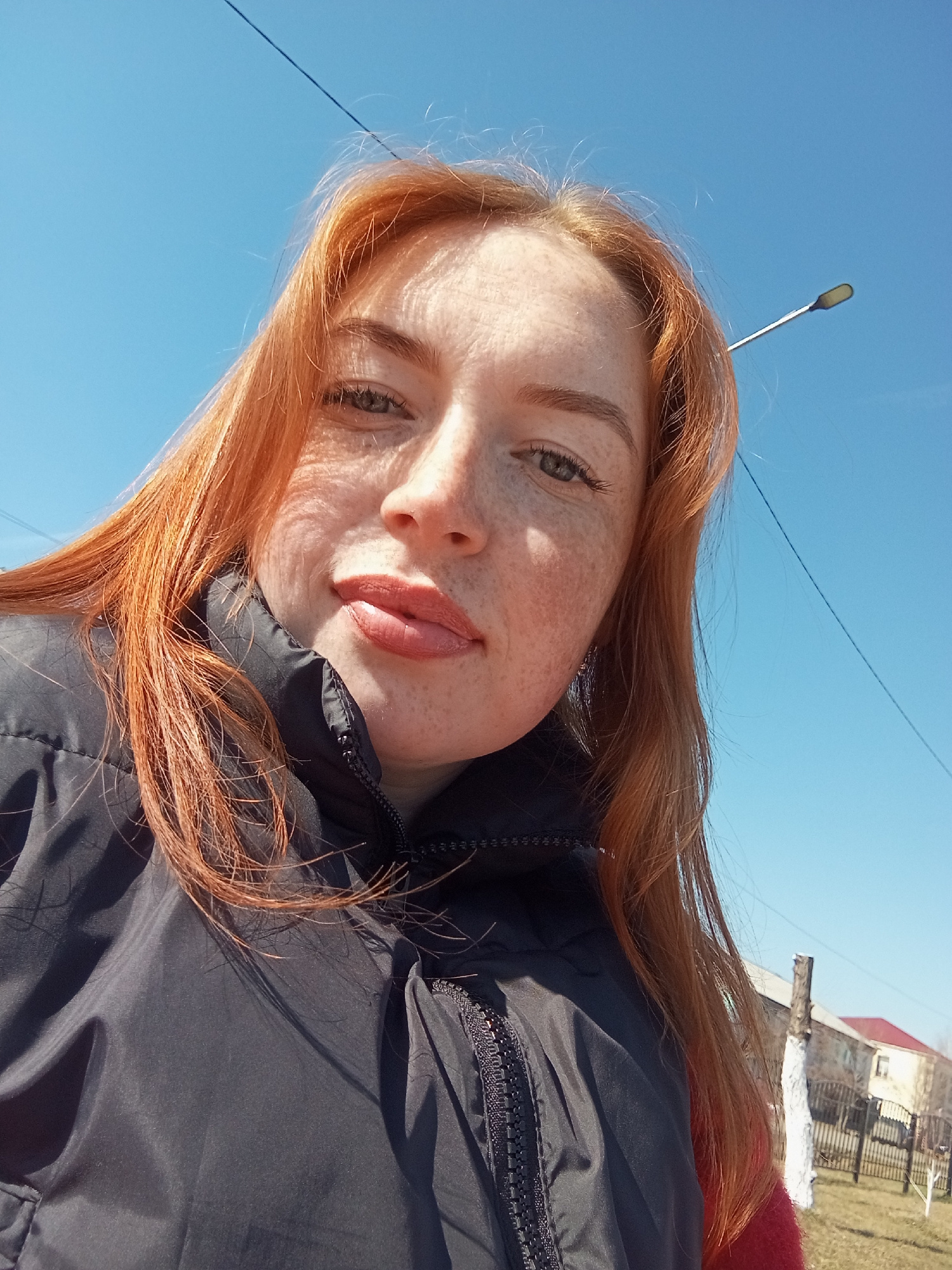 A young woman with red hair and freckles is taking a selfie outdoors under a bright blue sky. She is wearing a black puffy jacket with the zipper partially visible. The photograph appears to have been…read more