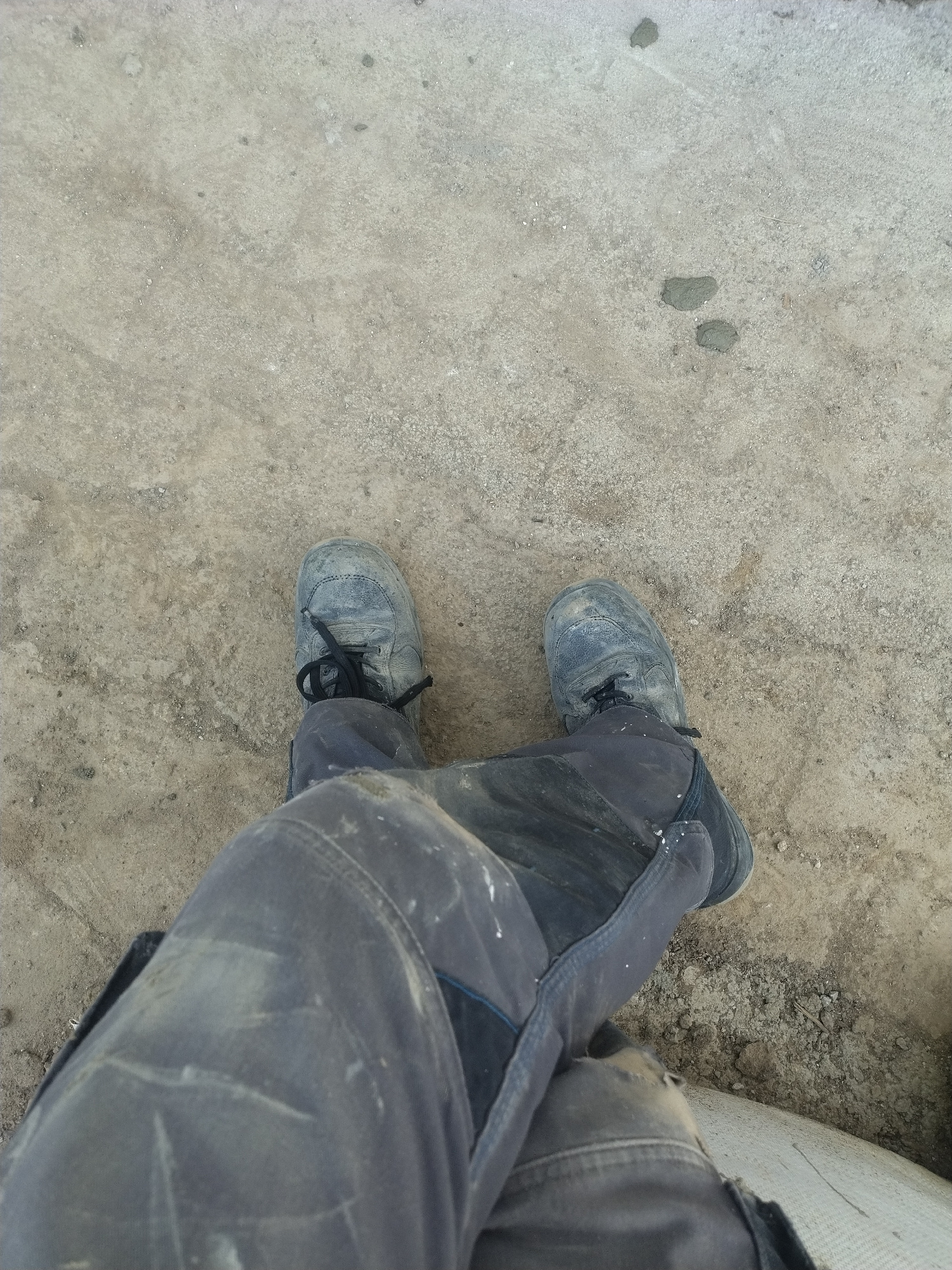 The image shows a downward view of a person's legs from the knees down, wearing gray work pants and dark, worn athletic shoes. The person is standing on a concrete surface with scattered dirt and smal…read more