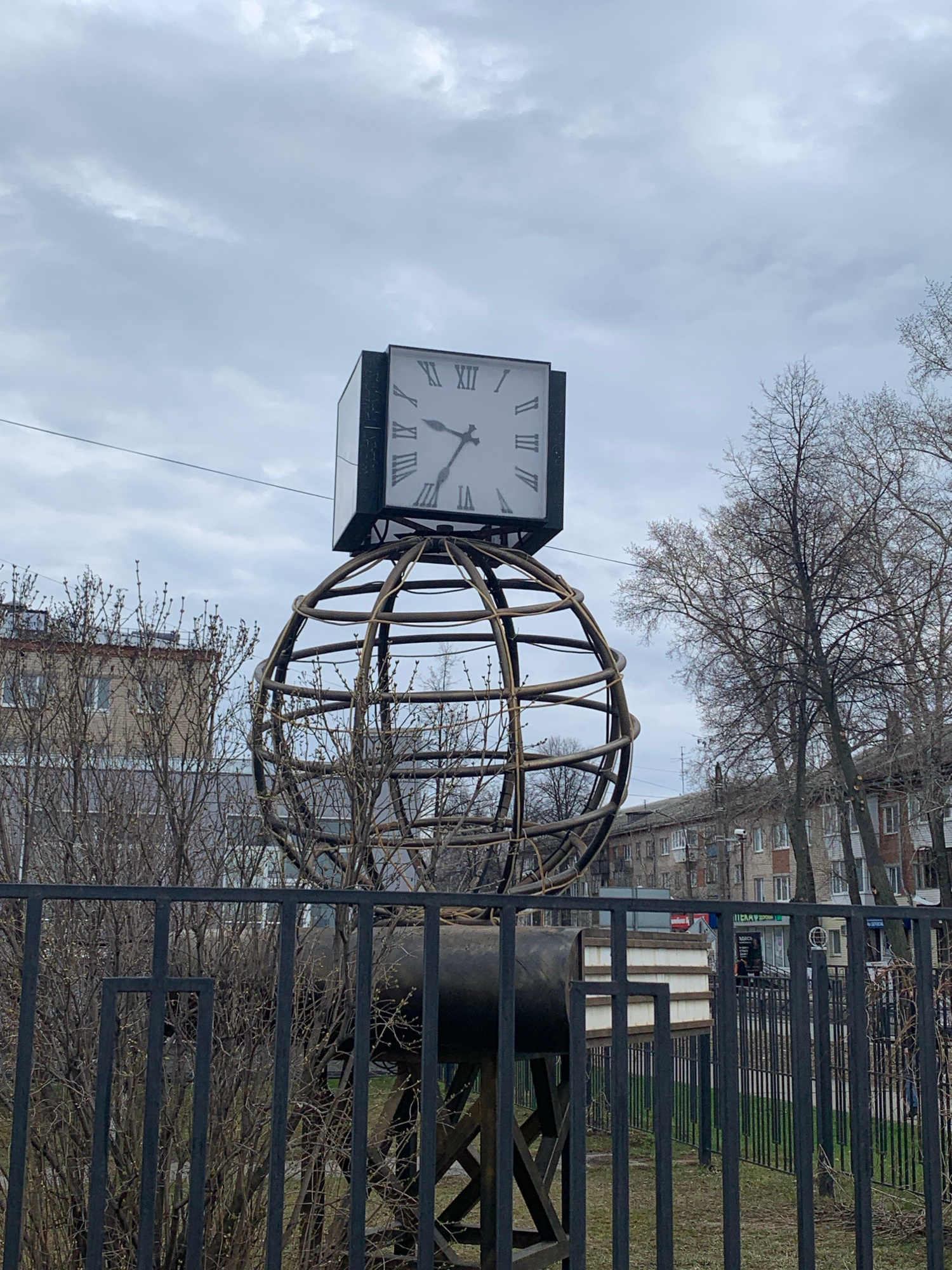 A street clock atop a metal globe is the focal point of the image. The clock face is white with black Roman numerals. The globe is constructed of curved metal bars, creating a cage-like structure. The…read more