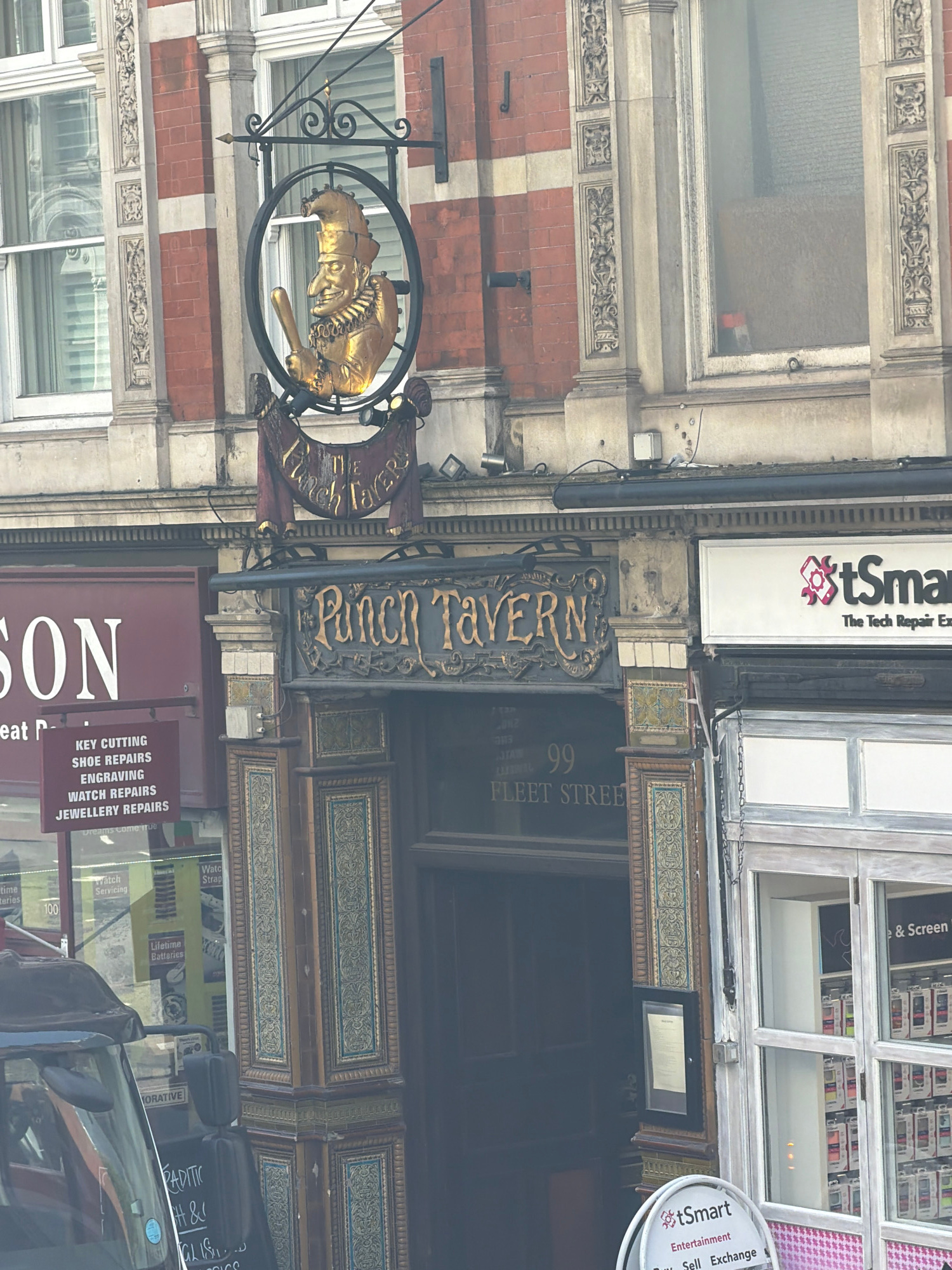 The image depicts the exterior of the Punch Tavern, located at 99 Fleet Street in London, United Kingdom. The building features intricate architectural details, including decorative moldings, brickwor…read more