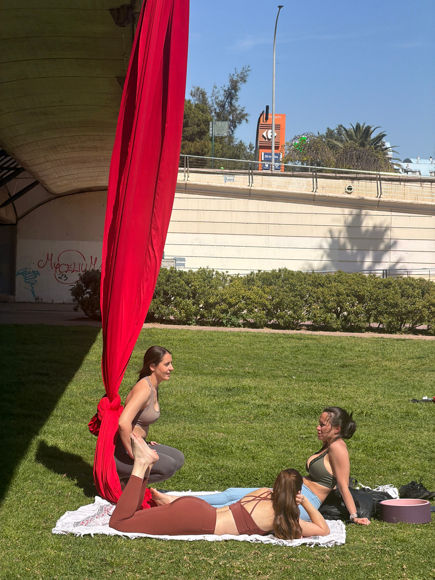 The image depicts three adult females participating in an outdoor activity within the Turia Gardens, Valencia, Spain, on a sunny day. In the foreground, a verdant grassy area occupies the lower half…read more