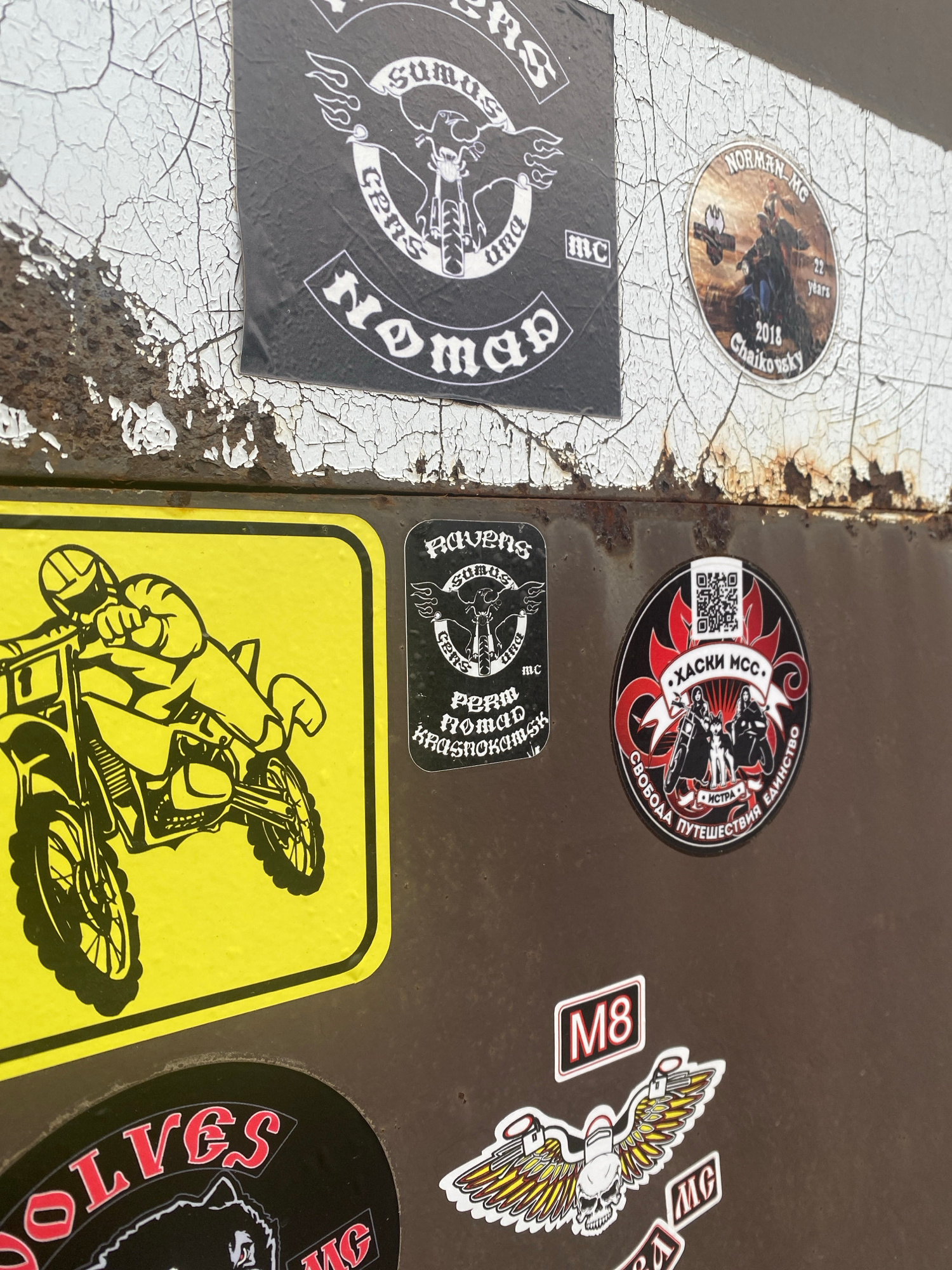 This image shows a close-up of a surface covered in stickers, likely belonging to or associated with motorcycle clubs (MC). The surface is divided into two sections, one painted white with a cracked t…read more